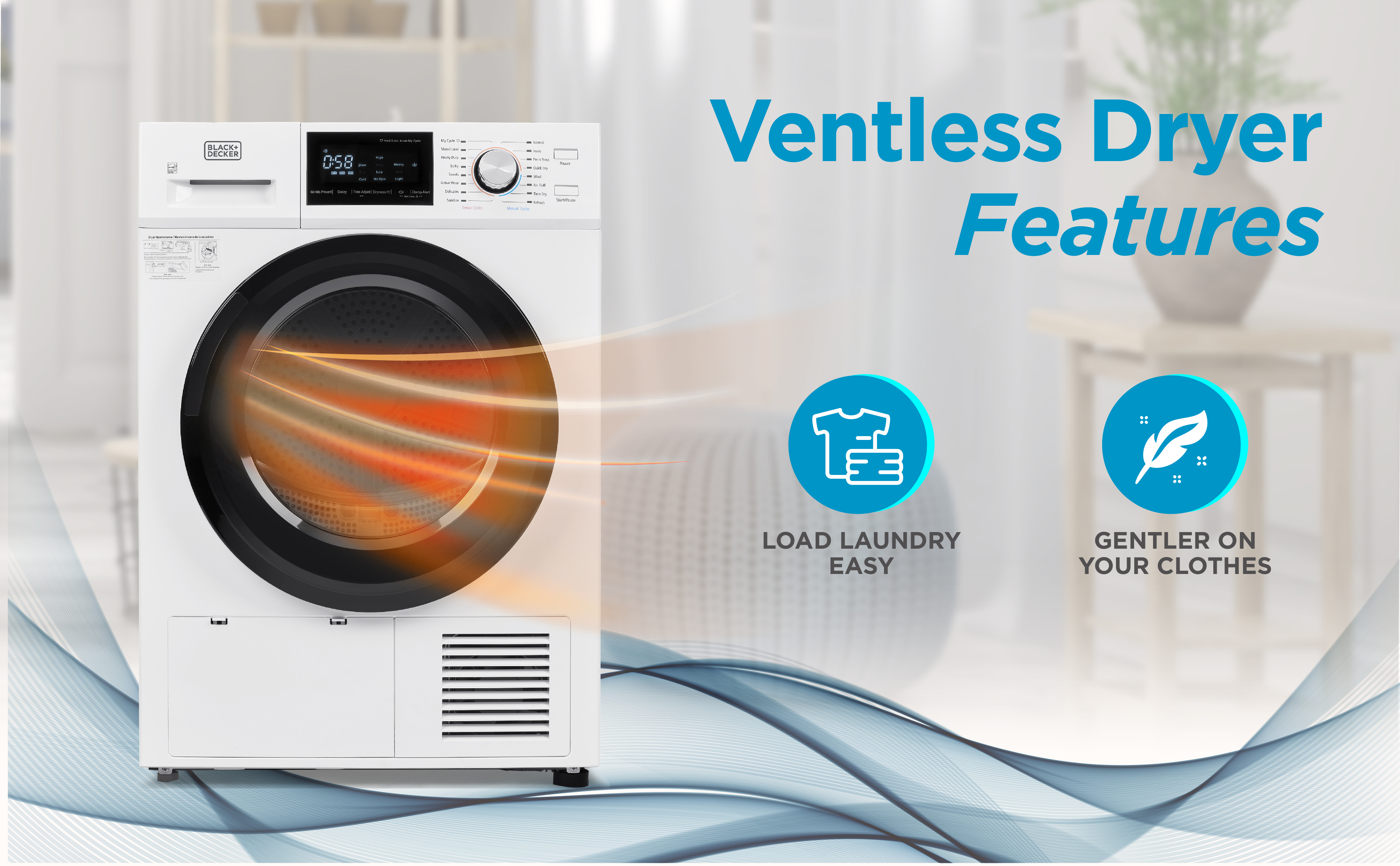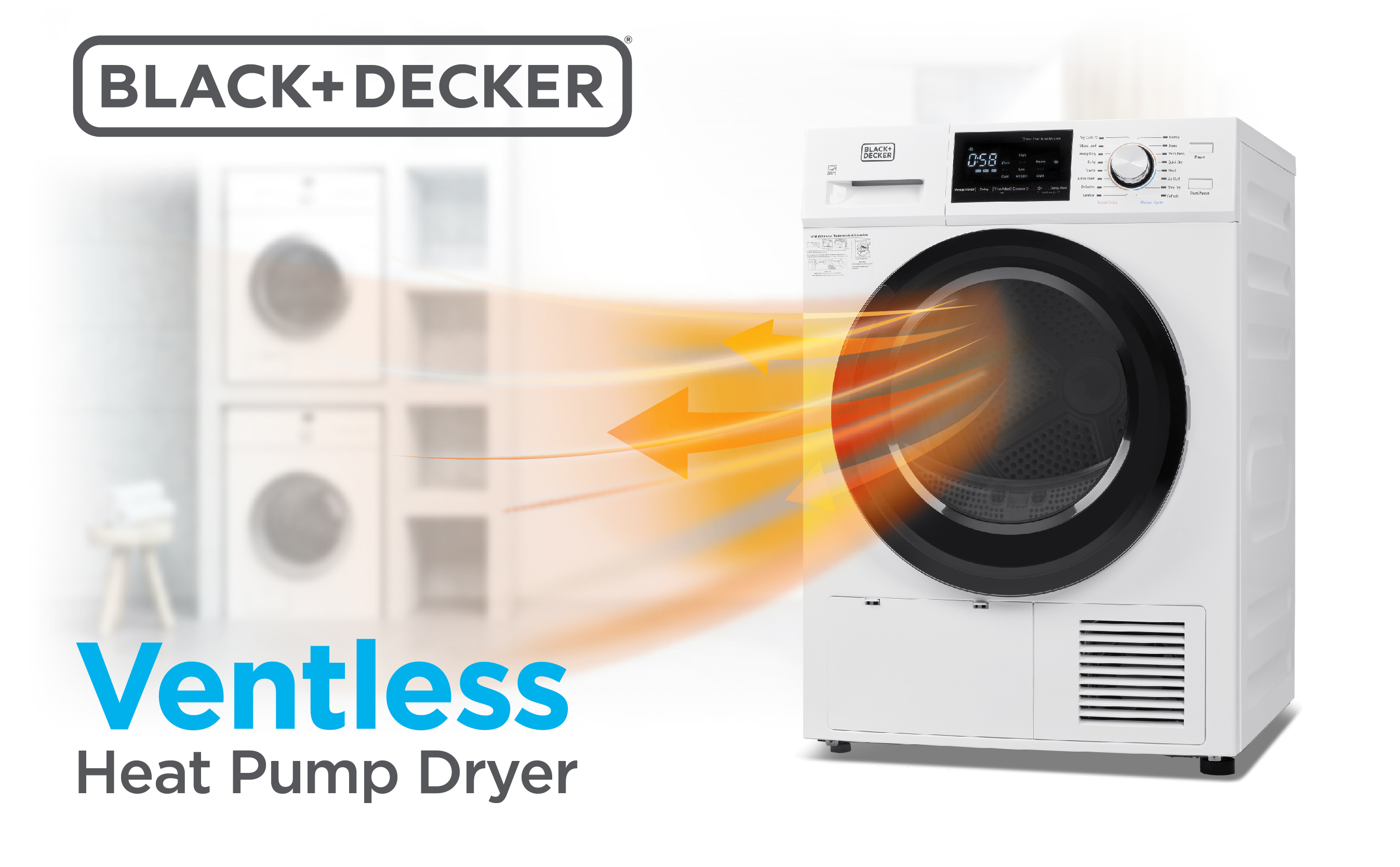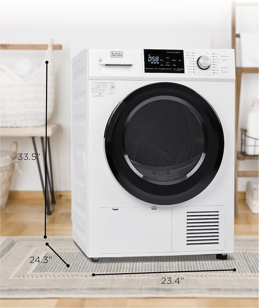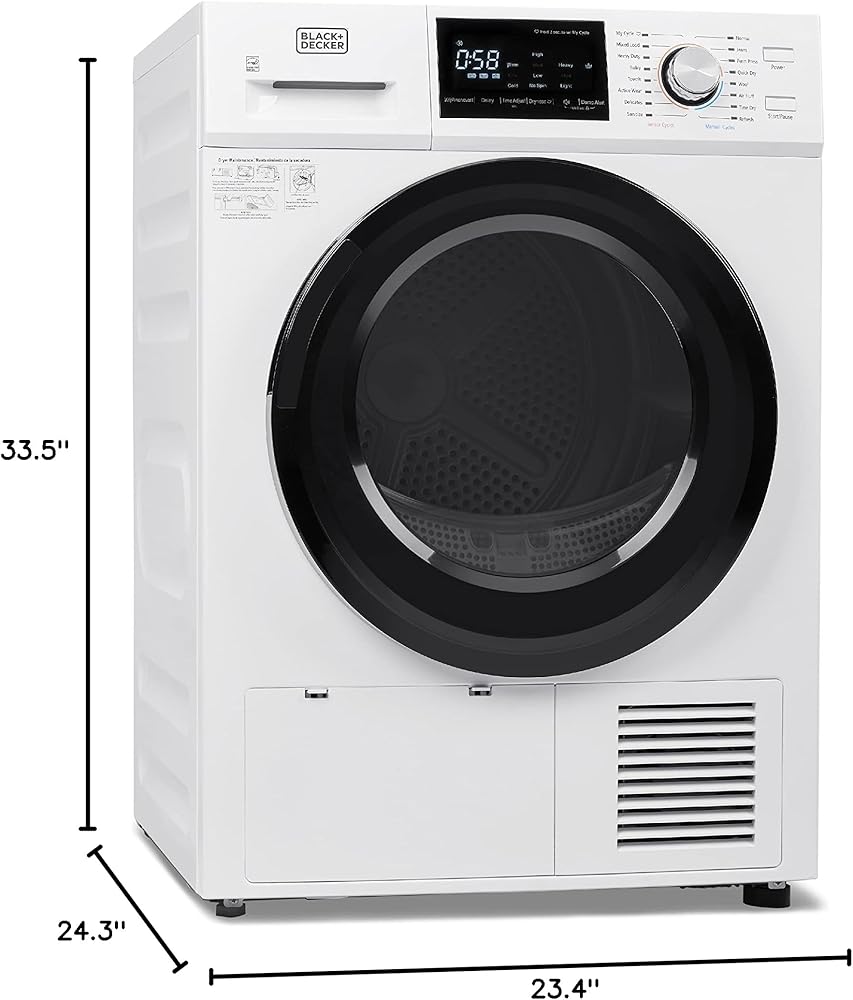This amazing BLACK+DECKER heat pump dryer (23.4” x 24.3” x 33.5”) is a must-have for laundry day. With 16 drying cycles to choose from— My Cycle, Mixed Load, Heavy Duty, Bulky, Towels, Active Wear, Delicates, Sanitize, Normal, Jeans, Perm Press, Quick Dry, Wool, Air Fluff, Time Dry, and Refresh. Configure My Cycle to save and reuse a frequently used program! Easy to use with a LED digital display. No vent is required! Enjoy an easy installation for any room of your apartment or home. No need to cut holes in your walls to vent outside! Our outstanding electric dryer machine (121.25 lbs.) is made of a zinc-coated stainless steel tub with a front loading transparent door. The heat pump technology reduces energy consumption by at least 28% compared to conventional dryers. The air is recirculated, and water deposited into tank, which can be easily removed or drained with included hose. This electric clothes dryer is Energy Star certified and absorbs moisture from wet clothes while recirculating compressor-cooled air. With a maximum clothing capacity of 22 lbs. our dryer has sensor dry technology, which assesses moisture and adjusts the heat accordingly. Note that drying times are usually longer with ventless dryers than vented. 220V/60Hz. This electric dryer comes with a 1-year limited warranty. ISTA-6A packaging ensures the product will be delivered safely to you.