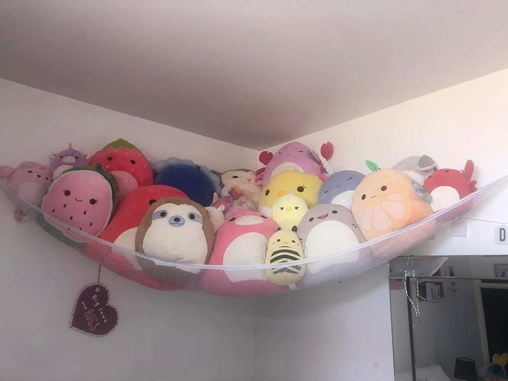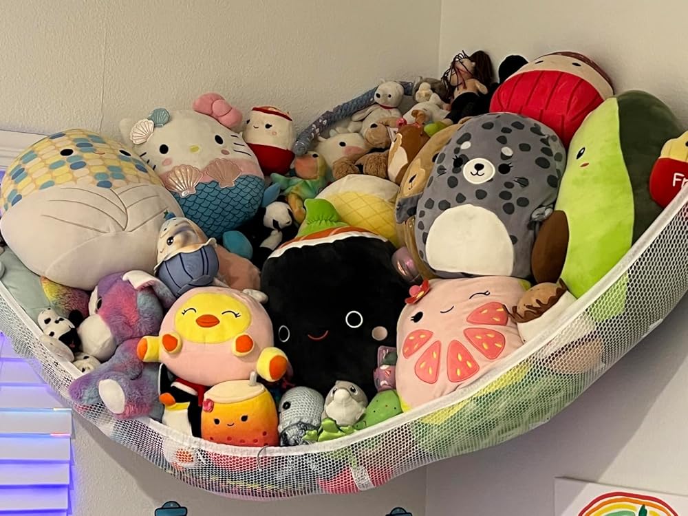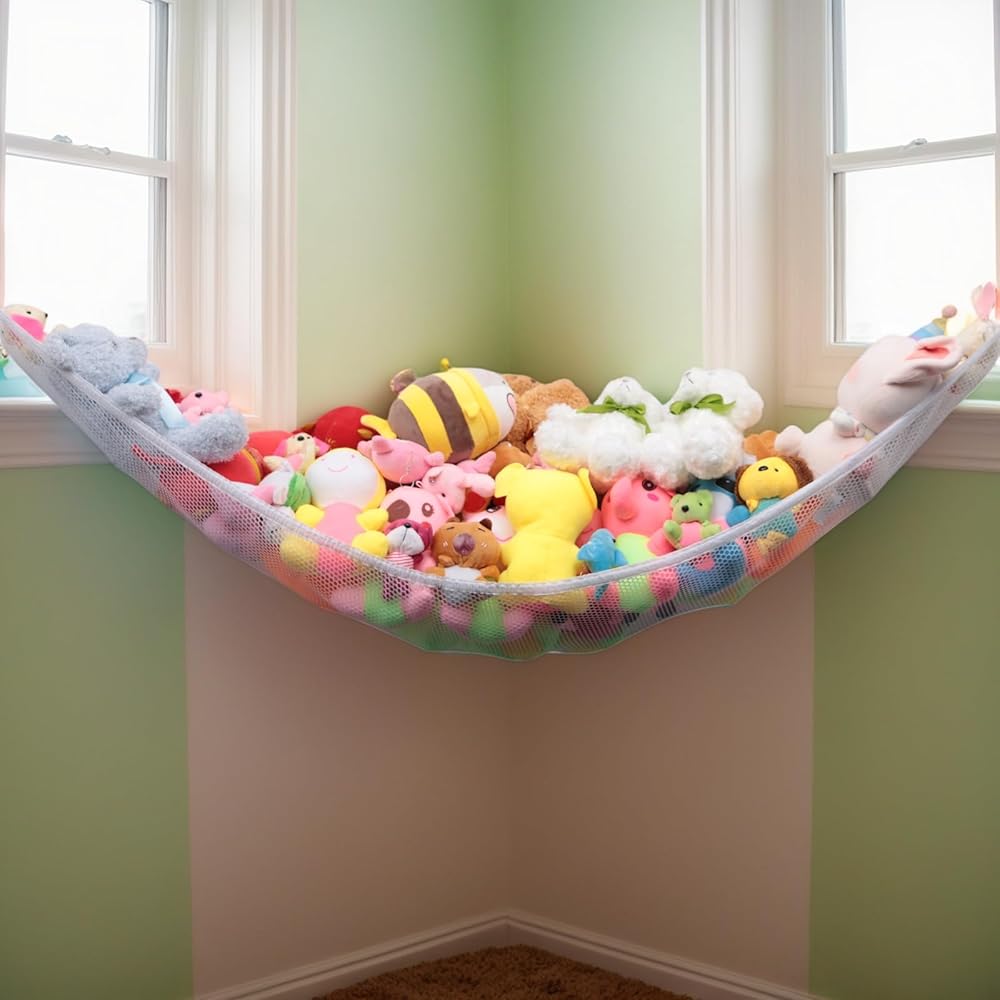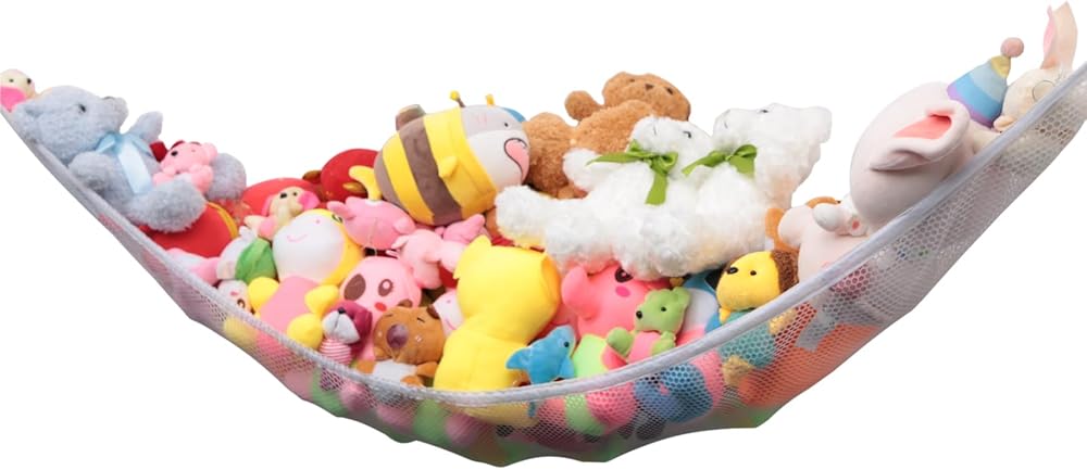 فكرة رائعة لتوفير المساحة، تحمل الكثير من الألعاب الناعمة، وتزيل غرفة النوم وغرفة اللعب وفوضى حوض الاستحمام أثناء تنظيم الألعاب بأناقة.