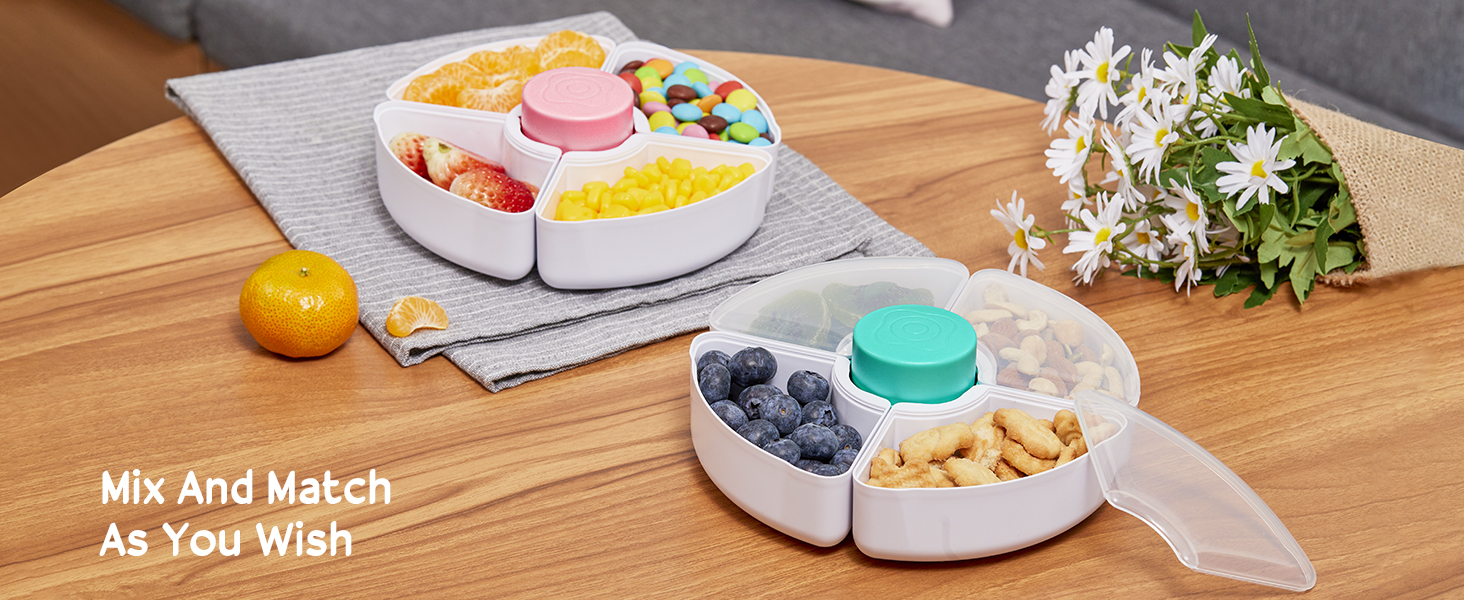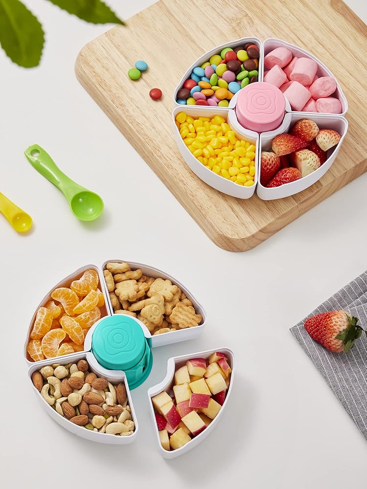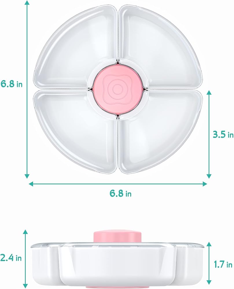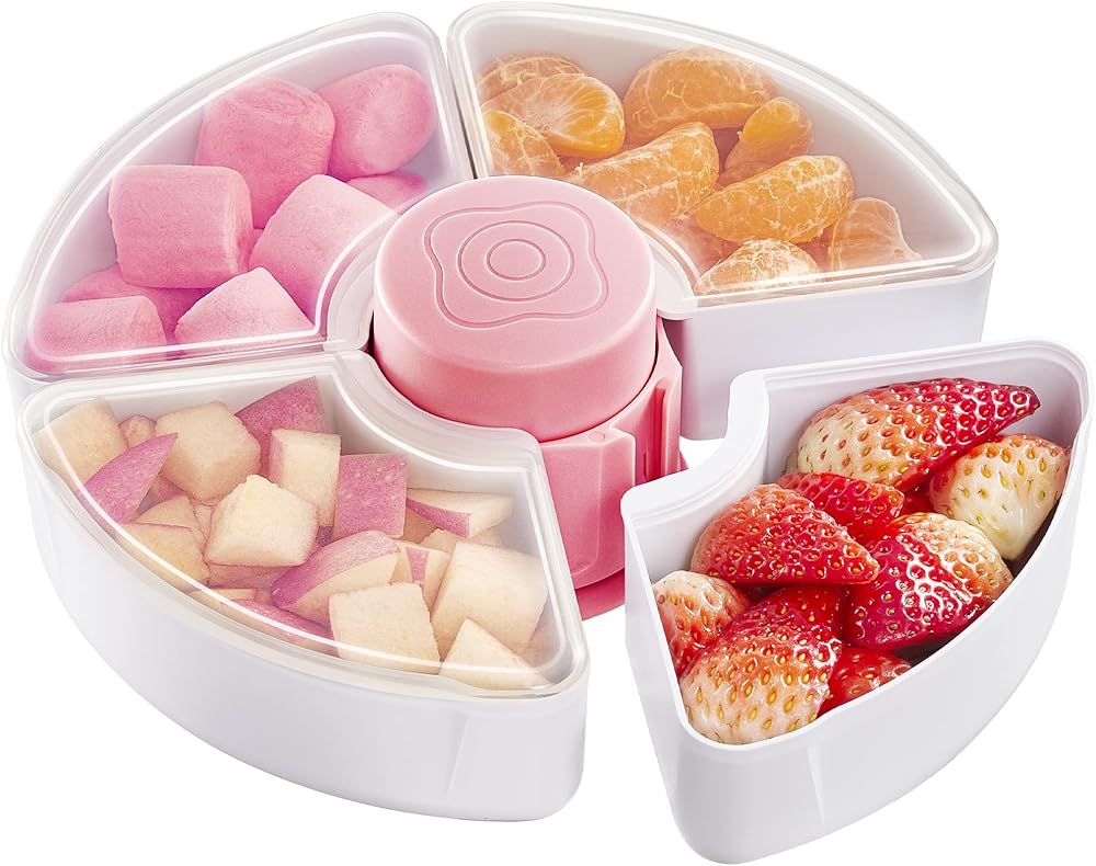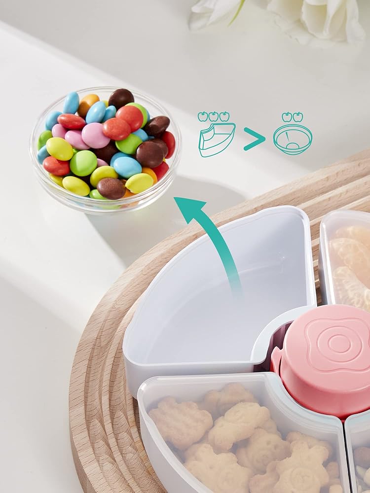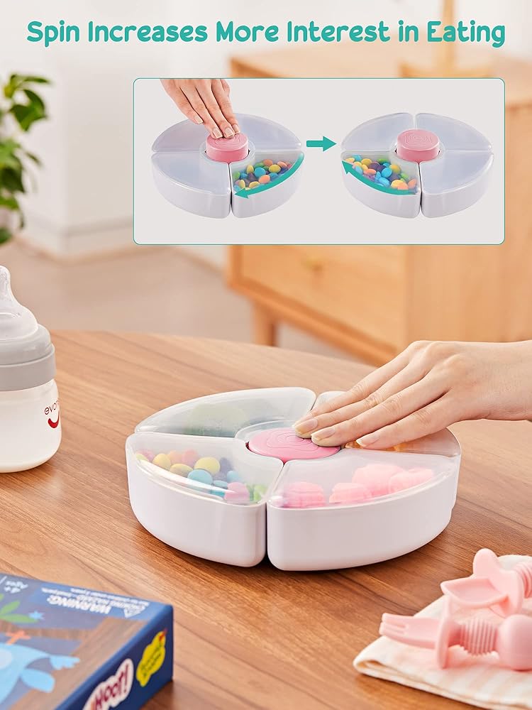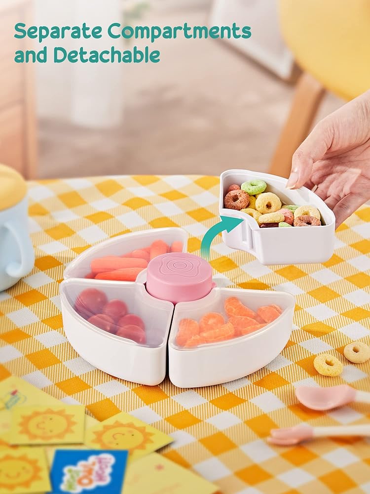عملي وممتع: يمكنك إخراج المقصورات ووضعها في غسالة الأطباق لسهولة التنظيف. تصميم الزر الدوار يسمح لحاوية الوجبات الخفيفة للأطفال بالدوران 90 درجة عند الضغط عليها، مما يزيد من اهتمام طفلك بتناول الطعام.