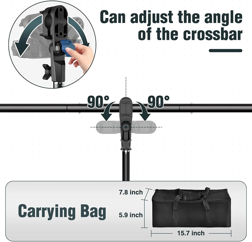 【عارضة قابلة للتعديل بزاوية 180 درجة】يقوم حامل الخلفية على شكل حرف T بترقية مقبض العارضة، والذي يمكن أن يغير الزاوية بين 0 درجة و180 درجة للوصول إلى أي وضع، ويمكنك أيضًا استخدامه كحامل ذراع ذراع للعاكس.