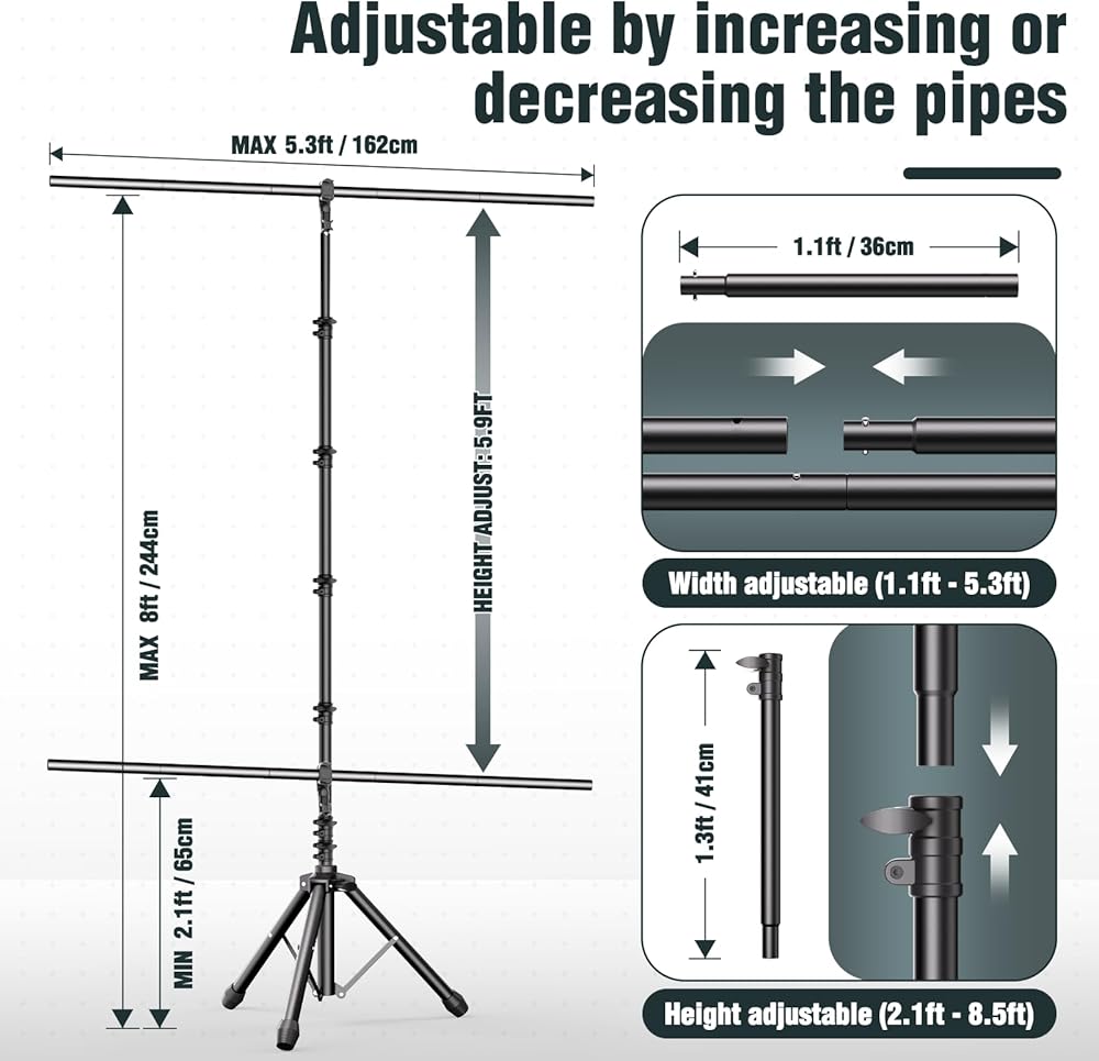 【العرض والارتفاع قابلان للتعديل】يمكنك بسهولة ضبط الارتفاع من 2 قدم إلى 8 أقدام والعرض من 1.3 قدم إلى 5 أقدام عن طريق زيادة وتقليل العمود. من السهل جدًا استخدام هذا الحامل