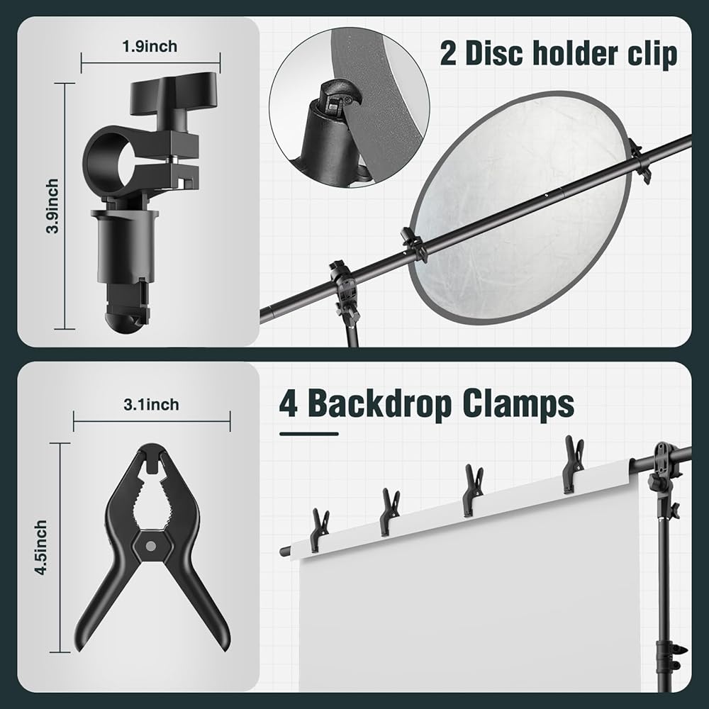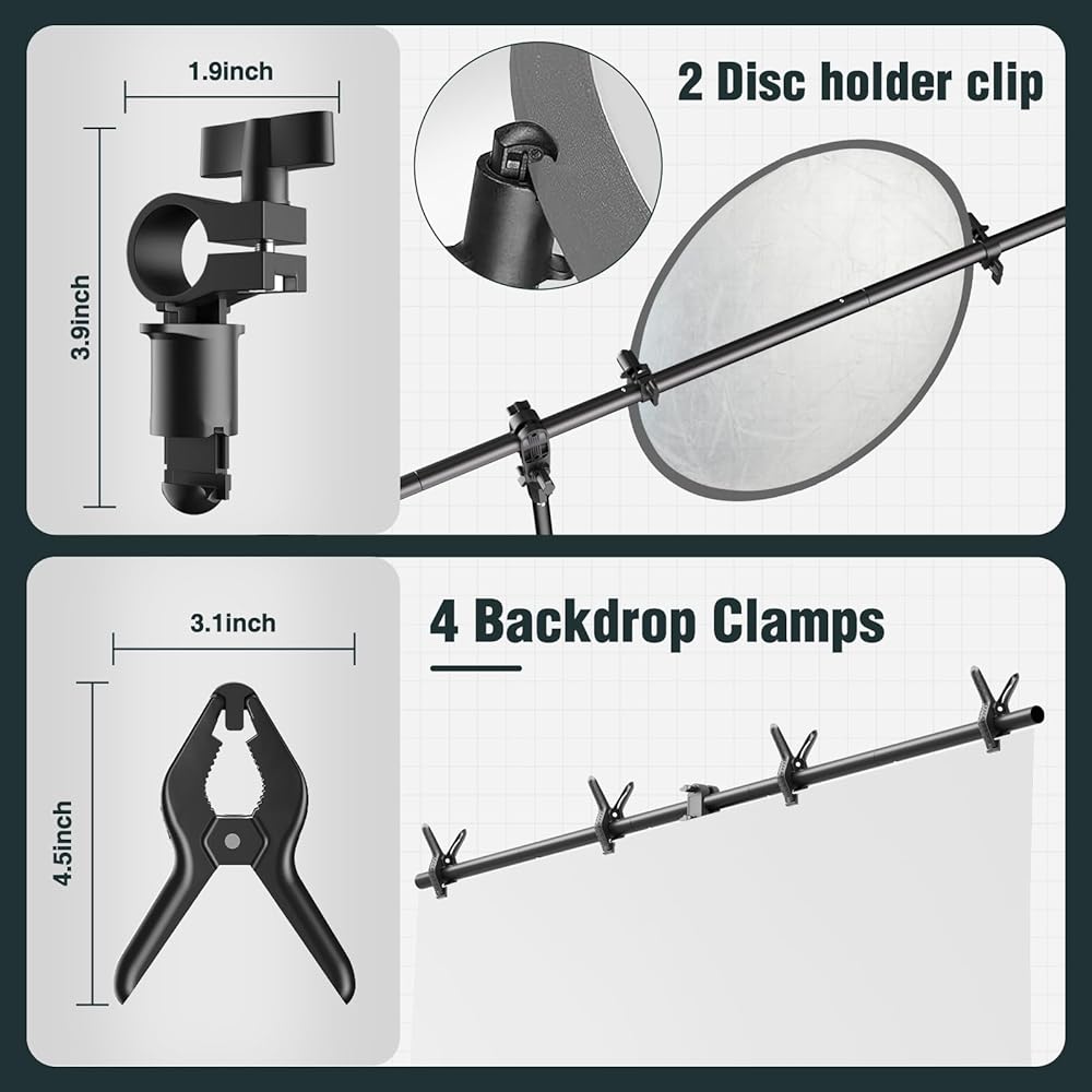 【حامل مشبك ومشبك مفيد】يأتي مع 4 مشابك وحامل مشبك قرصين لمساعدتك على ربط الخلفية أو العاكس على الحامل، مما يجعله مثاليًا للمبتدئين في التصوير الفوتوغرافي.