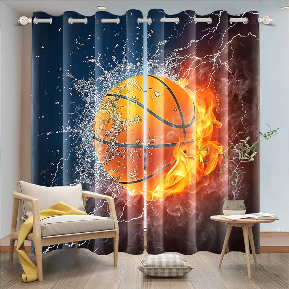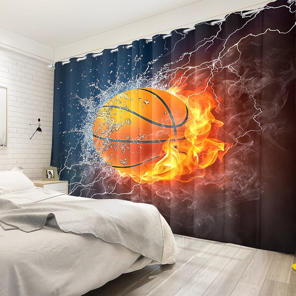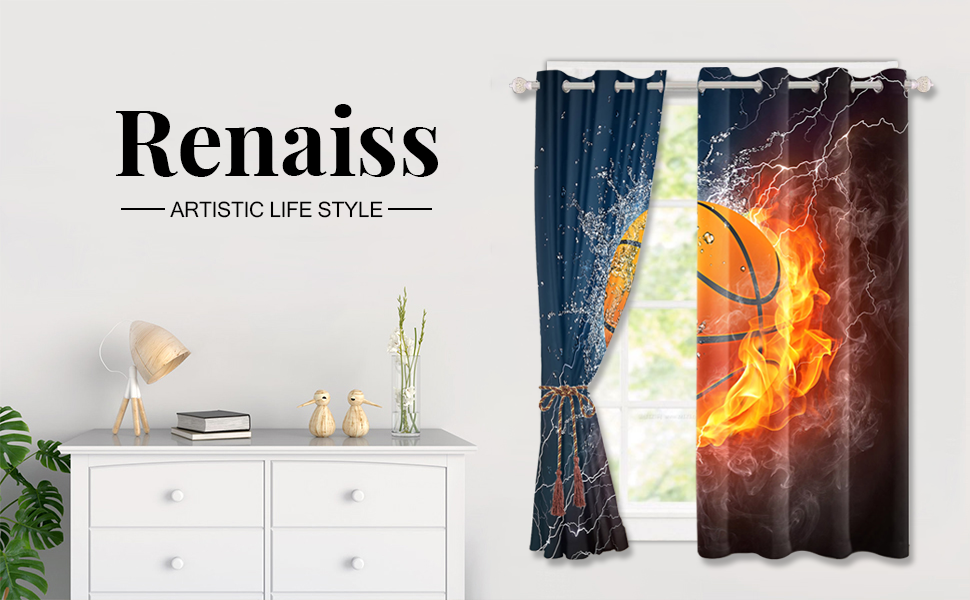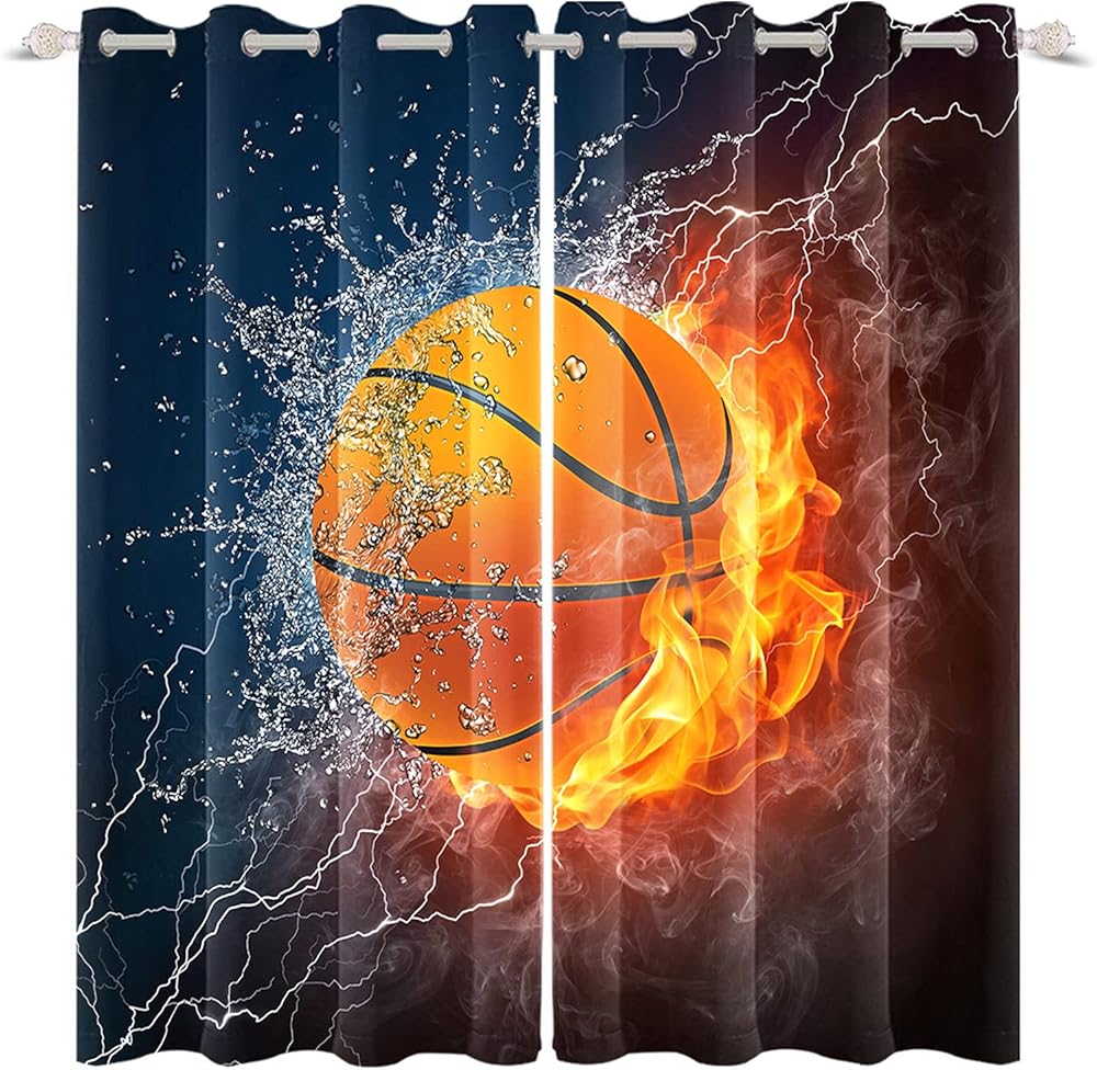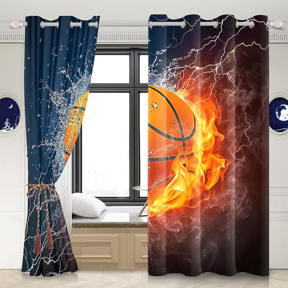renaiss حرق كرة السلة نافذة الستائر البرق كرة السلة نافذة العلاجات لهب الماء ضبابي ستائر التعتيم للبنين فتاة المراهقين غرفة نوم غرفة اللعب الديكور ديكور المنزل 21x45 بوصة × 2 لوحات
