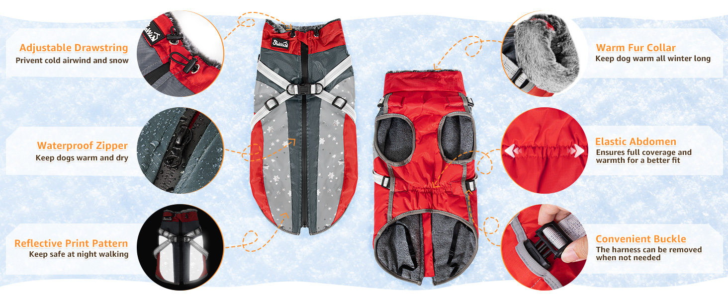• 【سحاب خلفي مقاوم للماء لسهولة الارتداء】--- السحاب الخلفي يسمح بارتداء وخلع الملابس بشكل مريح وسريع. ويوجد حزام ممتد أسفل السحاب يهدف إلى حماية شعر الكلب أو جلده عند سحبه.