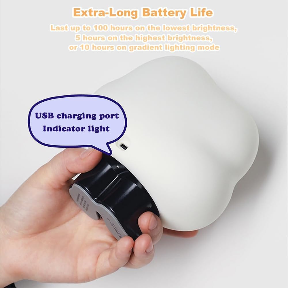 عمر بطارية طويل للغاية: يمكن أن يدوم مصباح LED السحابي حتى 100 ساعة بأقل سطوع، أو 5 ساعات على أعلى سطوع، أو 10 ساعات في وضع الإضاءة المتدرجة. تحتوي على بطارية مدمجة قابلة لإعادة الشحن؛ لا حاجة إلى استبدال البطارية.