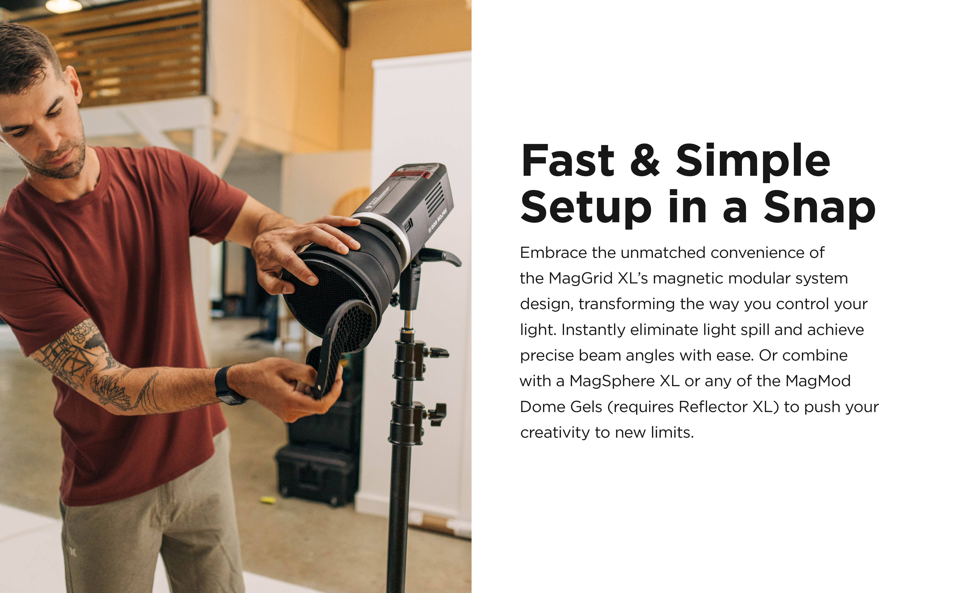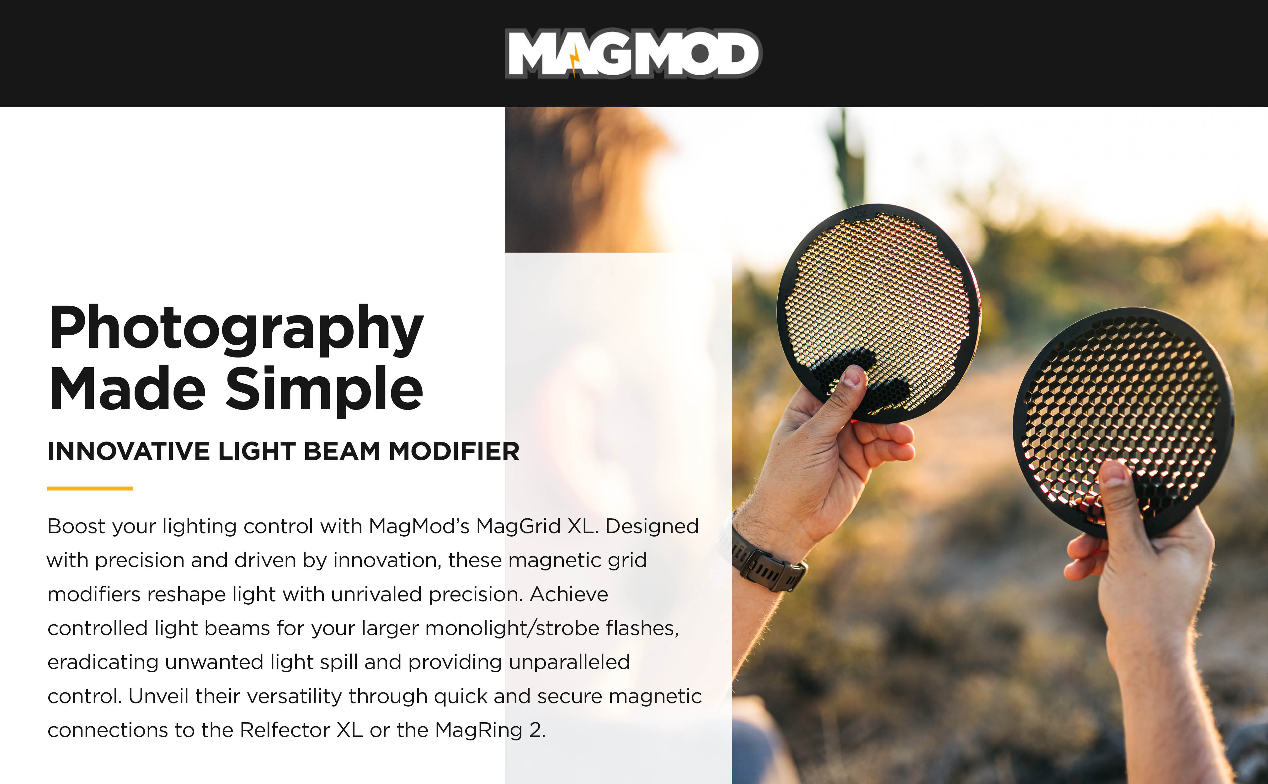 • With a MagGrid XL 20 on your strobe flash, you can instantly eliminate light spill and control beam angle in a flash. It's fast, quiet, and totally awesome.