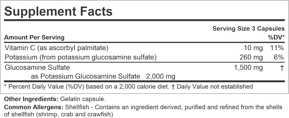 مكونات نشطة بيولوجيًا نقية 100% - توفر مستوى مثبتًا وشكلًا مثاليًا من كبريتات الجلوكوزامين إلى جانب فيتامين C والبوتاسيوم. لا يحتوي على حليب / خالي من منتجات الألبان، خالي من الغلوتين؛ لا يوجد فول الصويا أو الخميرة أو الذرة أو القمح أو الصوديوم أو الملح أو السكر أو الدهون أو الكوليسترول أو اللون أو المواد الحافظة أو إضافات التصنيع. يحتوي على مكون مشتق ومنقى ومكرر من قذائف المحار (الروبيان وسرطان البحر وجراد البحر).