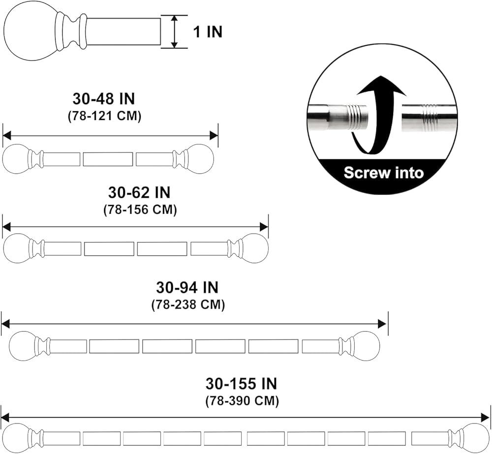 ➤ يتم تمديد قضيب الستارة المعدني هذا بنظام ربط متعدد القضبان. إنه ليس القضيب التلسكوبي التقليدي القابل للتعديل. أقصر طول هو 30 بوصة. يتم تمديد كل قضيب توصيل بمقدار 20 بوصة ويمكن تمديده بإضافة قضيب توصيل حسب الحجم المطلوب.