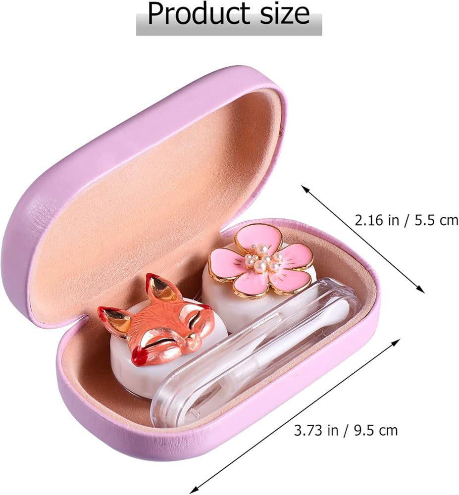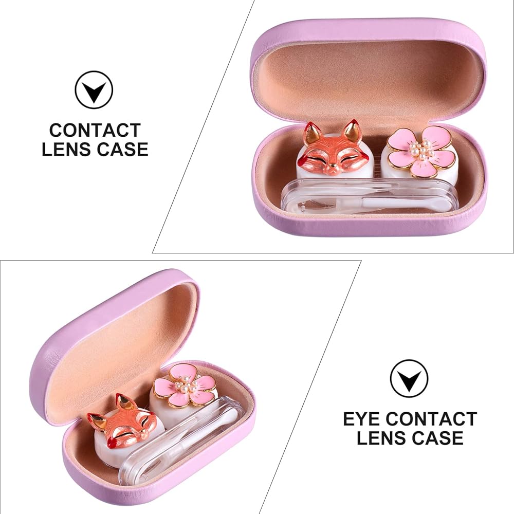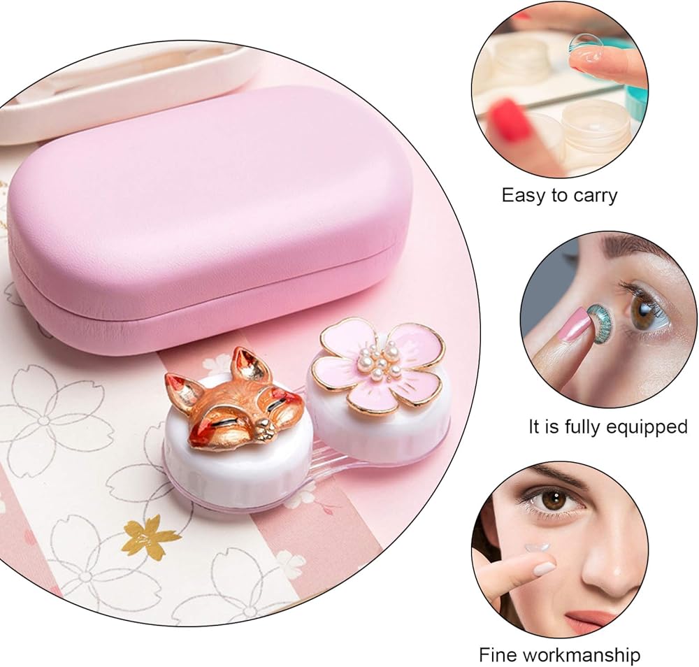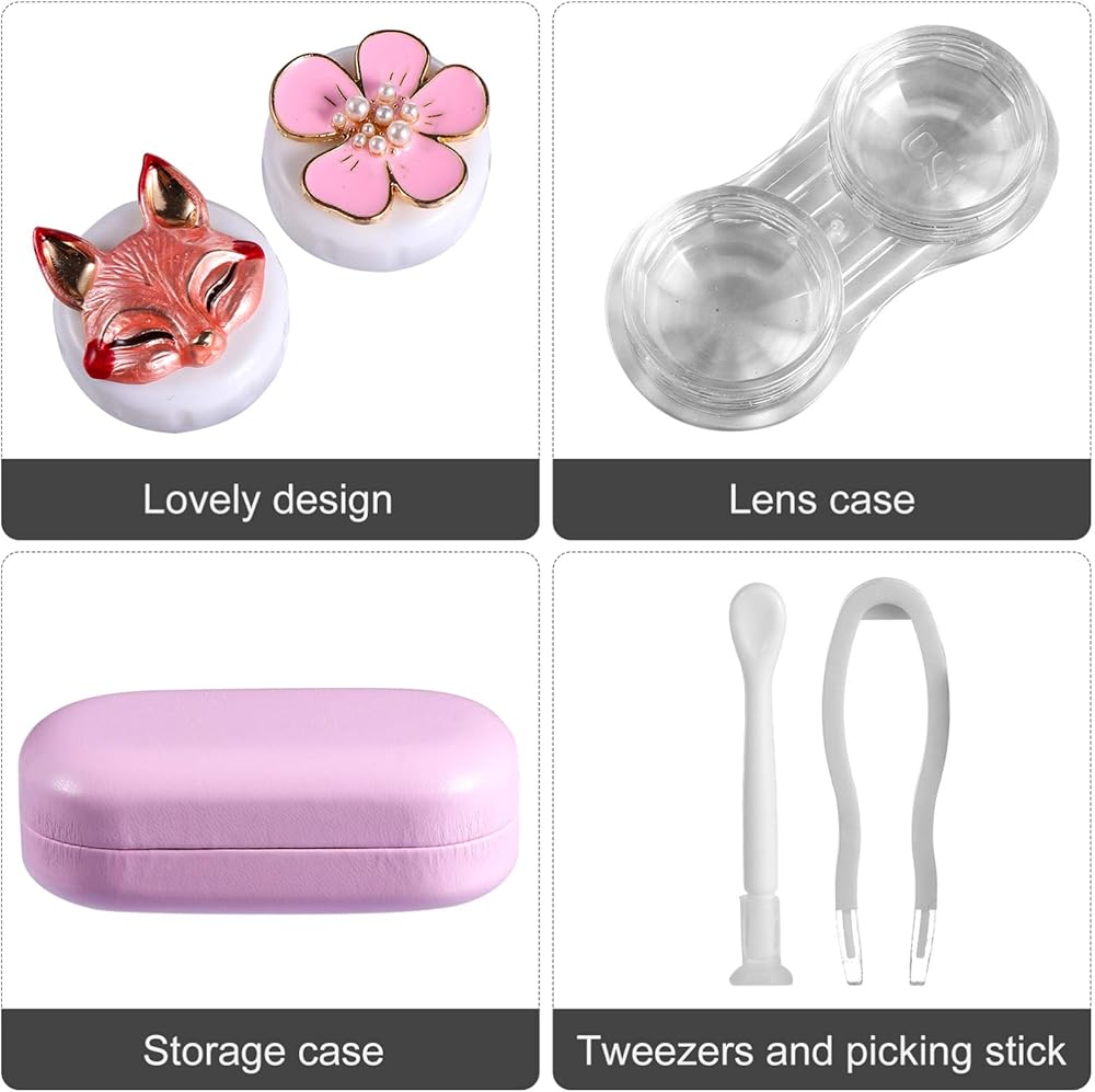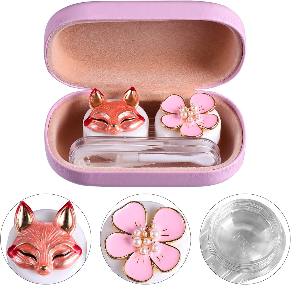 حافظة عدسات لاصقة بتصميم زهرة الثعلب الكرتوني، صندوق منظم محمول مع مراة واداة ازالة الملقط للاستخدام اليومي في الهواء الطلق، زهري, زهري, محمول