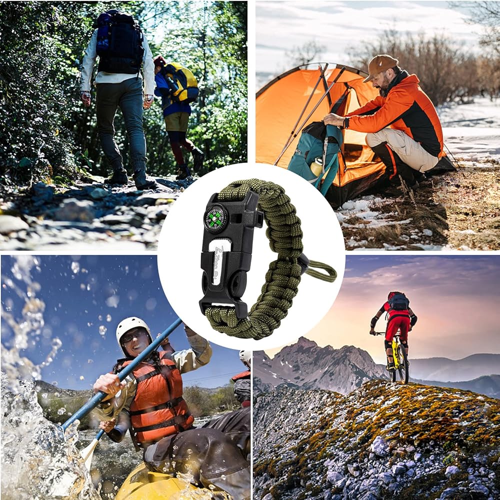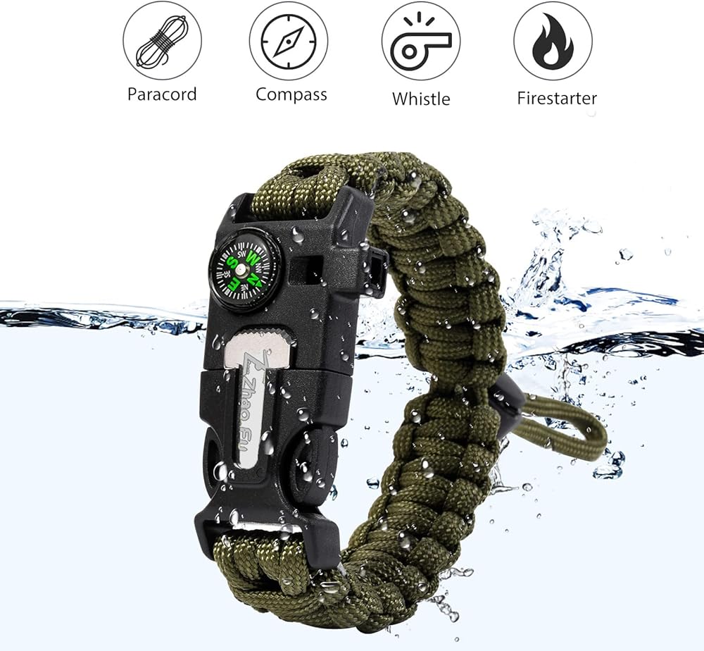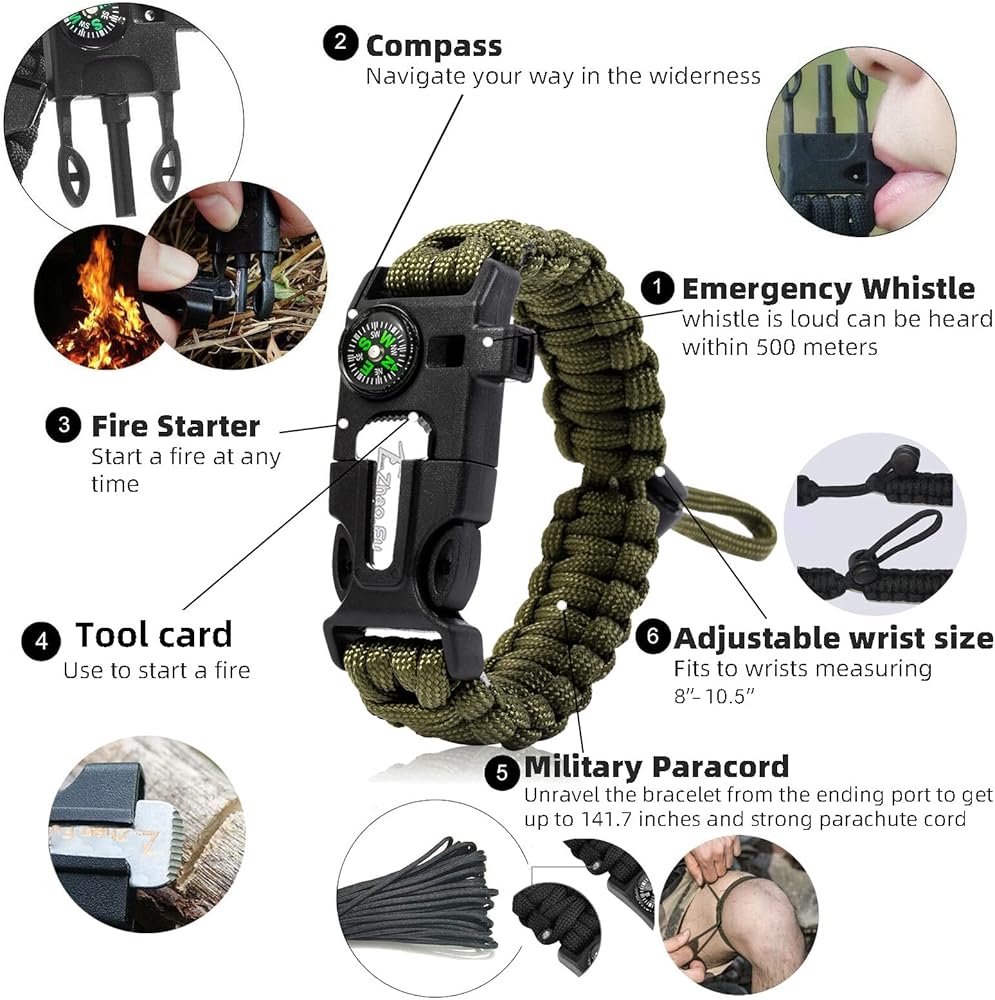 معدات النجاة 5 في 1: 5 أدوات النجاة، بوصلة، مشعل نار، بطاقة أدوات، باراكورد، صفارة. يمكن استخدام حبل باراكورد كمصيدة أو مأوى أو حبل غسيل أو رباط حذاء أو خشب مربوط، ويمكن استخدام القلب الداخلي للحبل كخط صيد أو خيط تنظيف الأسنان. سوار النجاة يعادل مجموعة من المعدات التكتيكية