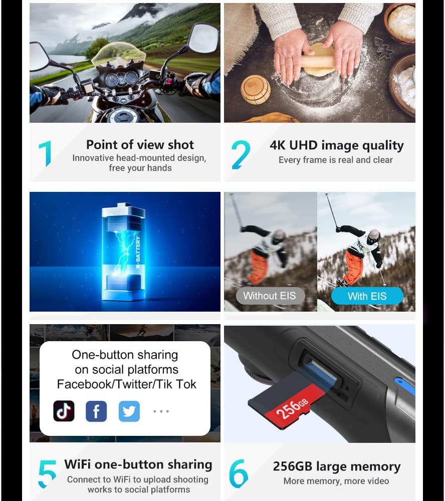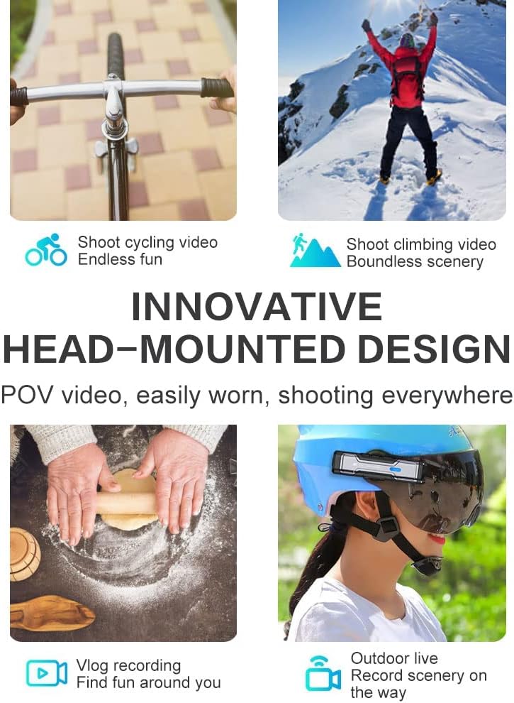 تصميم مبتكر لأغطية الرأس، رؤية إنسانية، ملابس غير رسمية، التصوير في كل مكان، حرر يديك، مناسب لتصوير مجموعة متنوعة من المشاهد، ركوب الدراجات، تسلق الجبال، تسجيل مدونة الفيديو، البث المباشر في الهواء الطلق، في حين أن الكاميرا الحية الخارجية مقاومة للماء والغبار، وتركيز ثابت ذكي بذكاء اصطناعي التكنولوجيا مقاومة للماء في الهواء الطلق، ولا داعي للخوف من التصوير الفوتوغرافي بالكاميرات العارية