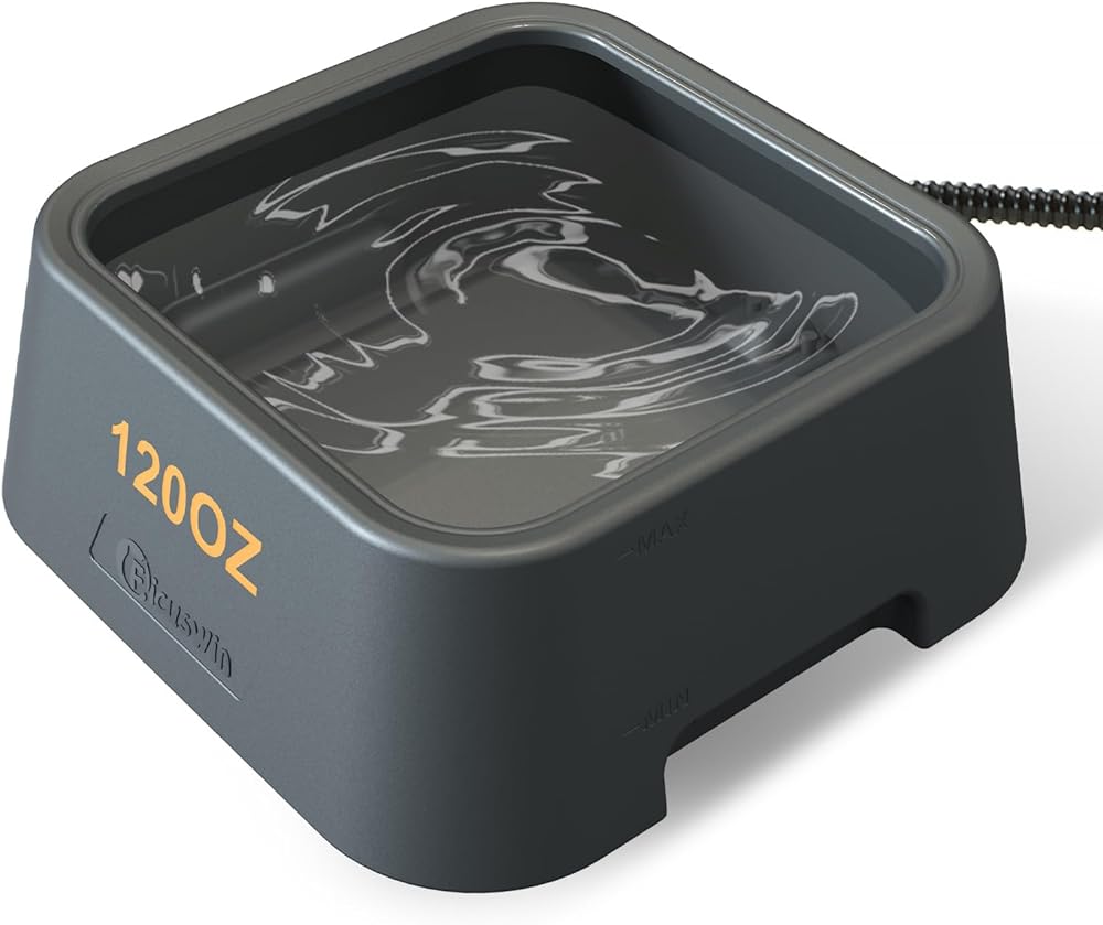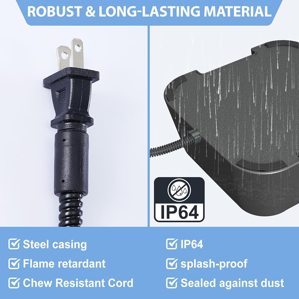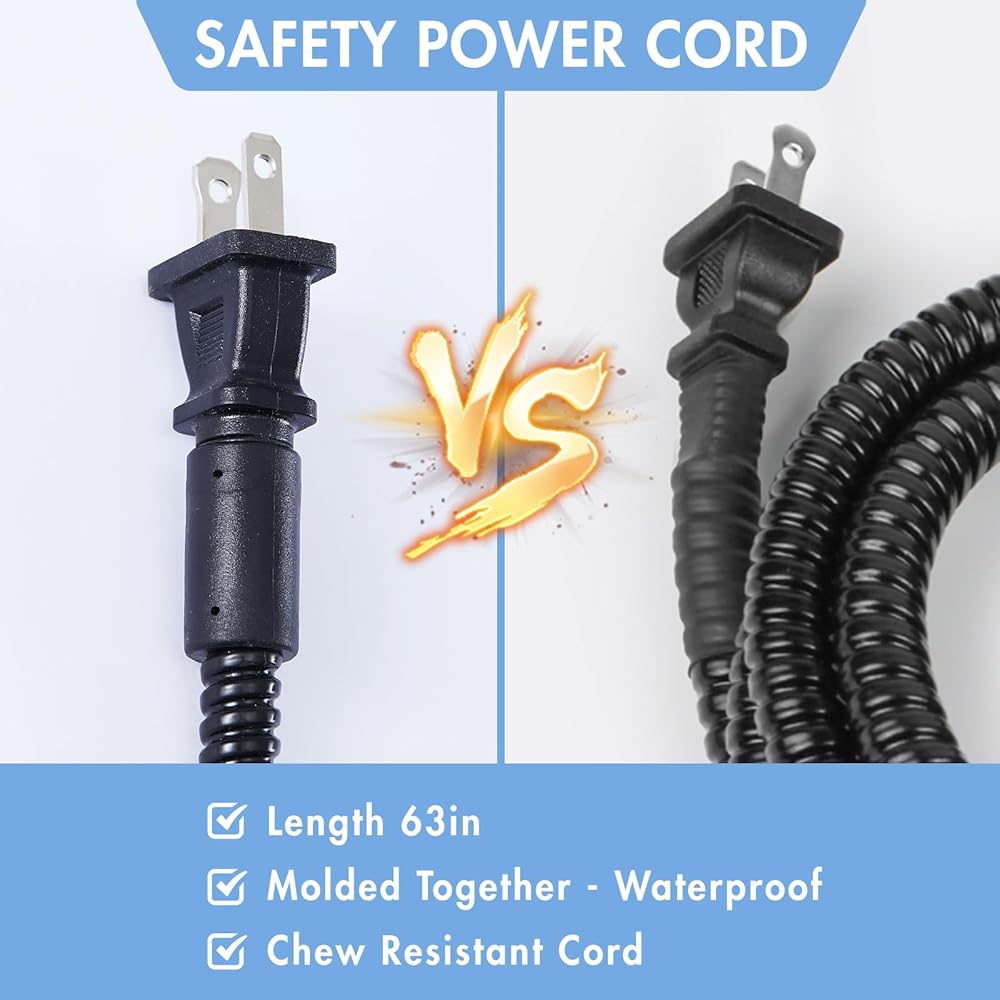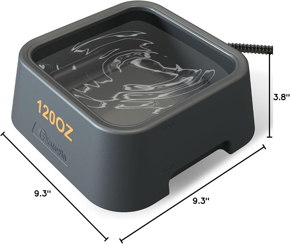 مع خط طاقة مقاوم للمضغ بطول 63 بوصة، هذا الوعاء آمن للحيوانات الأليفة ويمكن وضعه في الفناء أو الحظيرة أو المزرعة. تحتوي على 3.4 لتر من الماء، مما يوفر ما يكفي للشرب اليومي.