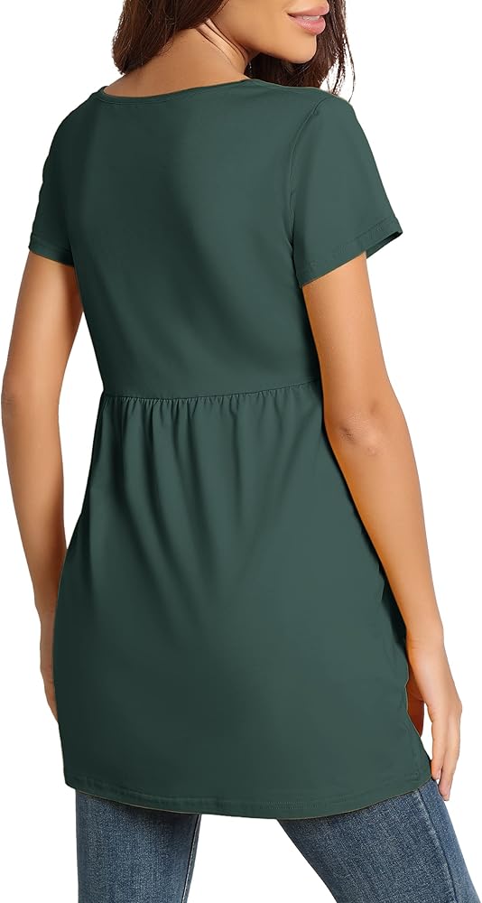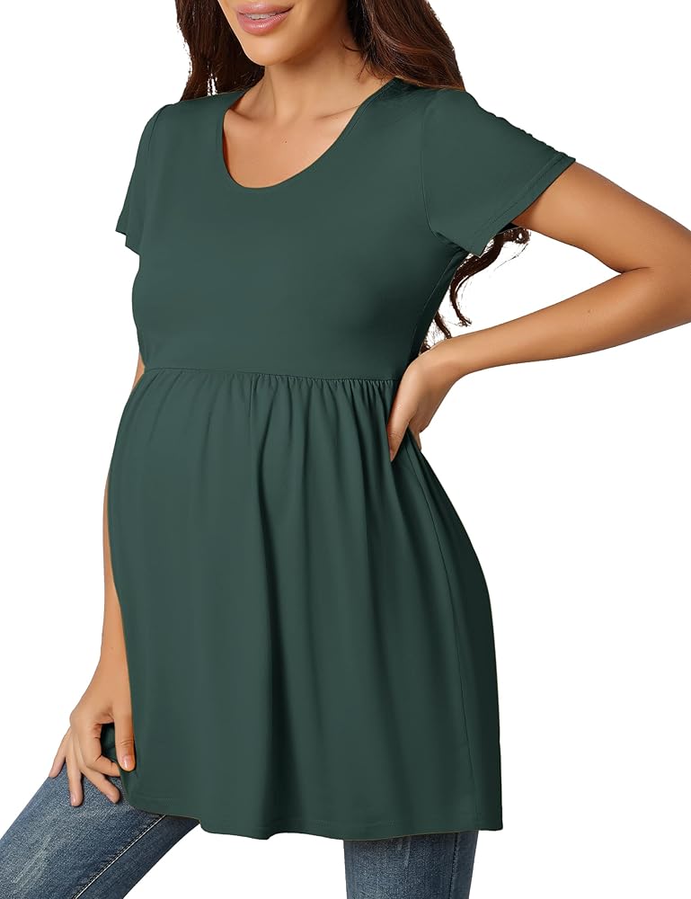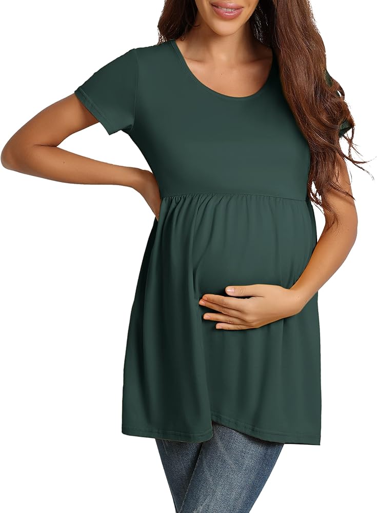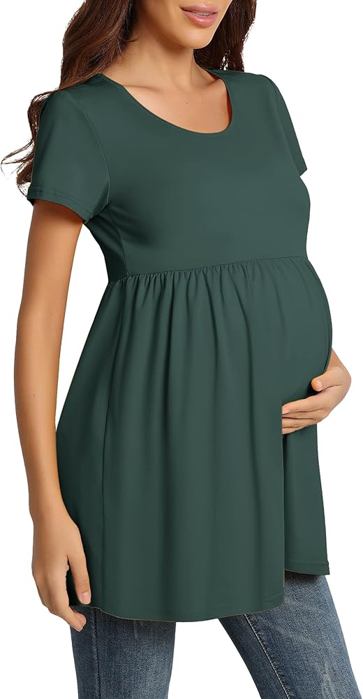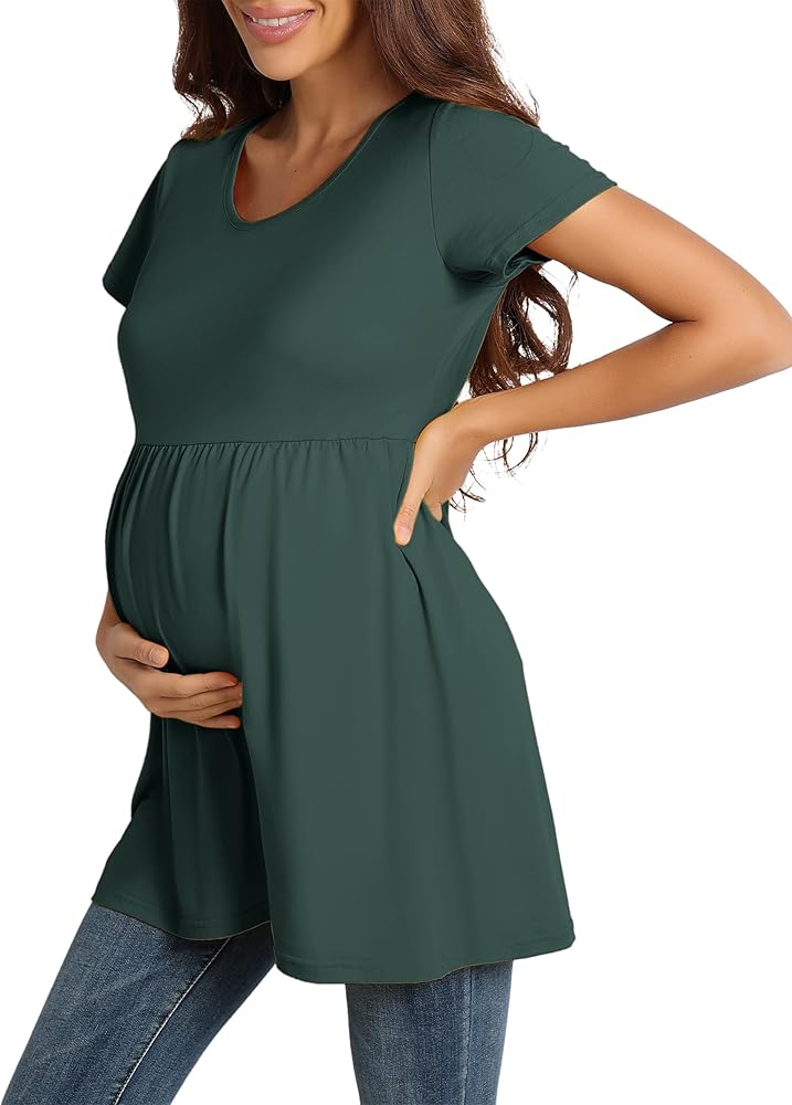 【بلايز تونيك للحمل】أكمام قصيرة ورقبة واسعة، قمصان تونيك للحمل على الخصر مكشكشة، قمصان للحمل، تظهر نتوء طفلك الملحوظ بطريقة لطيفة، كما أنها توفر مساحة كافية للنمو، وجذابة، ومناسبة بشكل جيد.