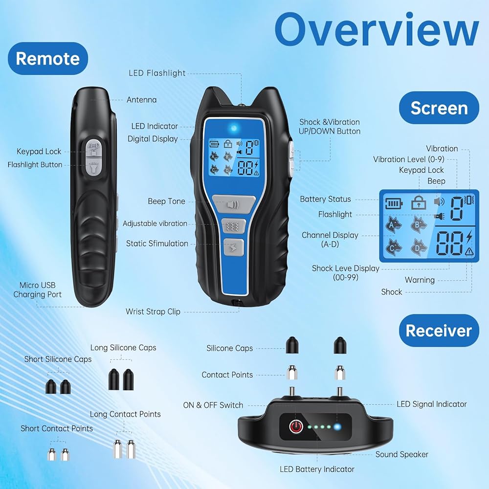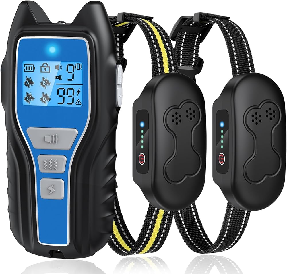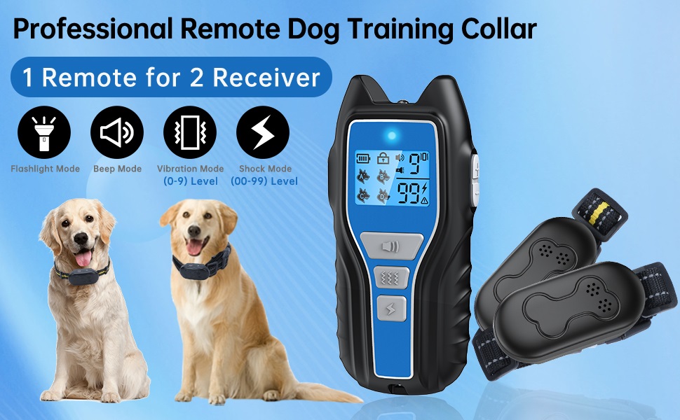 طوق صدمات للكلاب من owvtrg لكلبين (15-150 رطلًا) طوق تدريب كهربائي مقاوم للماء وقابل لإعادة الشحن مع جهاز تحكم عن بعد للكلاب الصغيرة والمتوسطة والكبيرة مع صوت تنبيه واهتزاز وصدمة آمنة وأوضاع مصباح يدوي (أزرق)