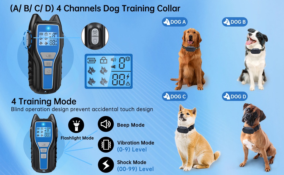 [1+4 قنوات أقصى تحكم وقفل لوحة المفاتيح] يحتوي جهاز التحكم عن بعد على 4 قنوات تسمح لك بالتحكم في 4 كلاب بشكل فردي أو تدريب 4 كلاب في نفس الوقت، تم تصميم جهاز التحكم عن بعد بقفل أمان لمنع التشغيل العرضي.