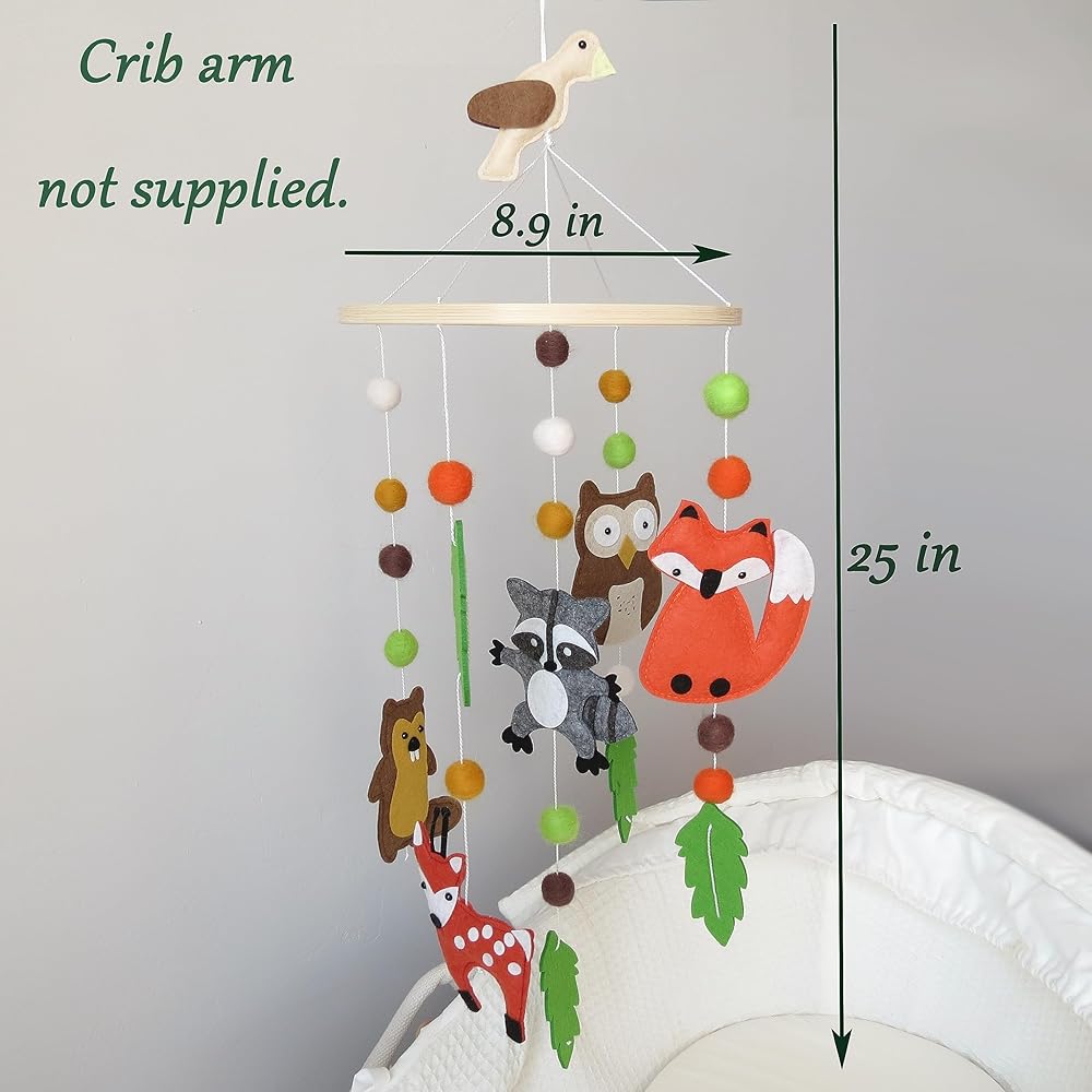 Woodland Forest Theme Mobile Nursery Decor Made From Environmental Materials and Featuring Fox, Deer, Raccoon, Groundhog, And Owl Designs, Have Green Leaves and Felt Ball. Please Note That the Crib Arm Attachment Is Not Included.