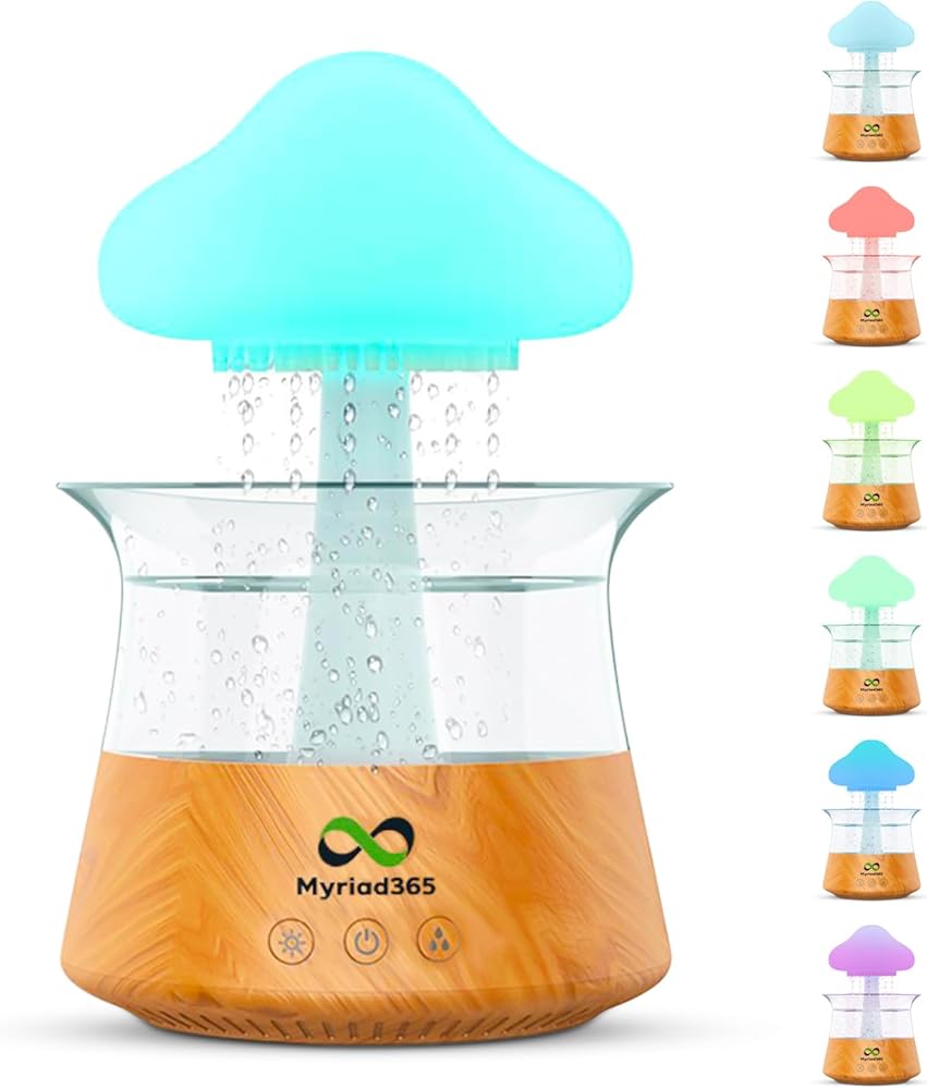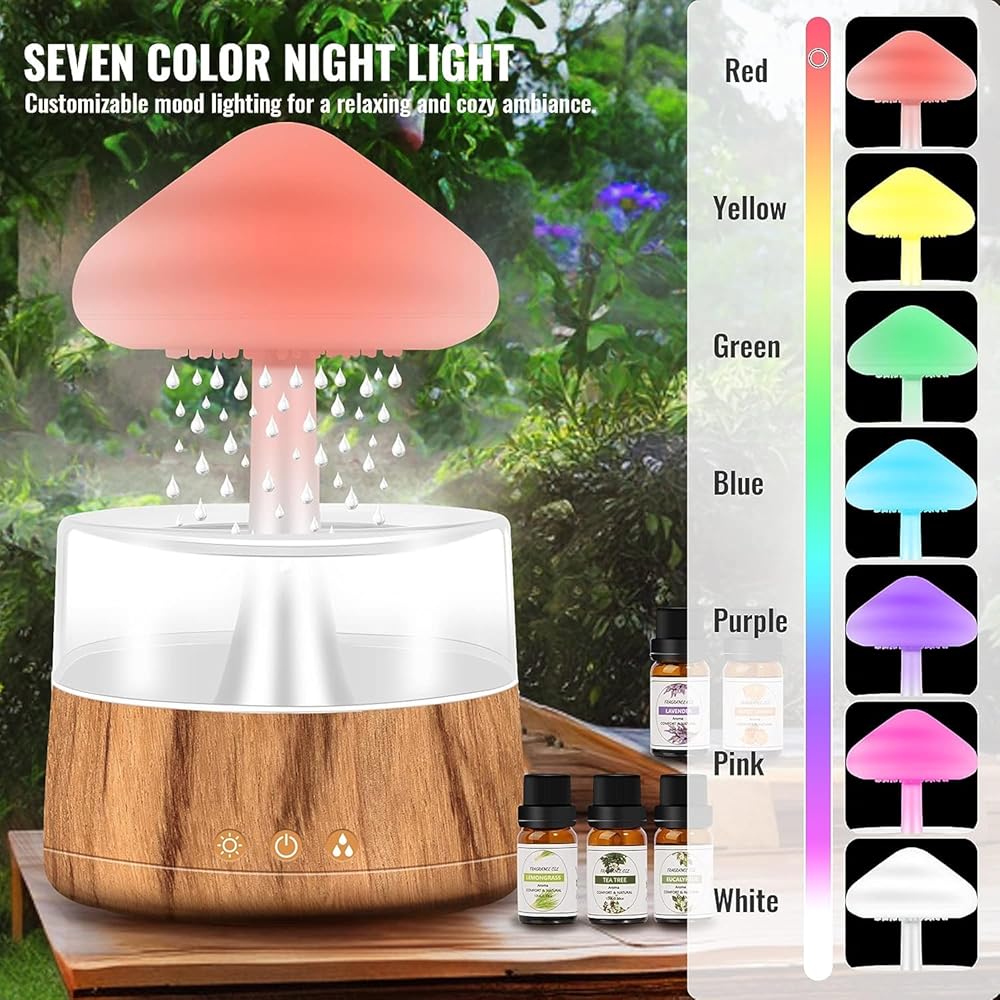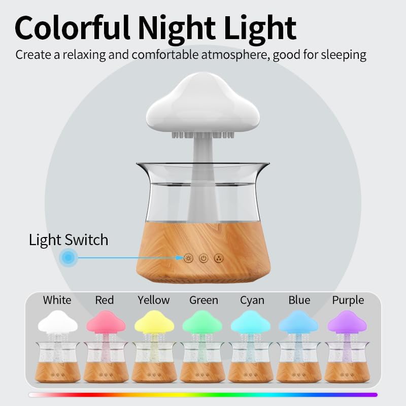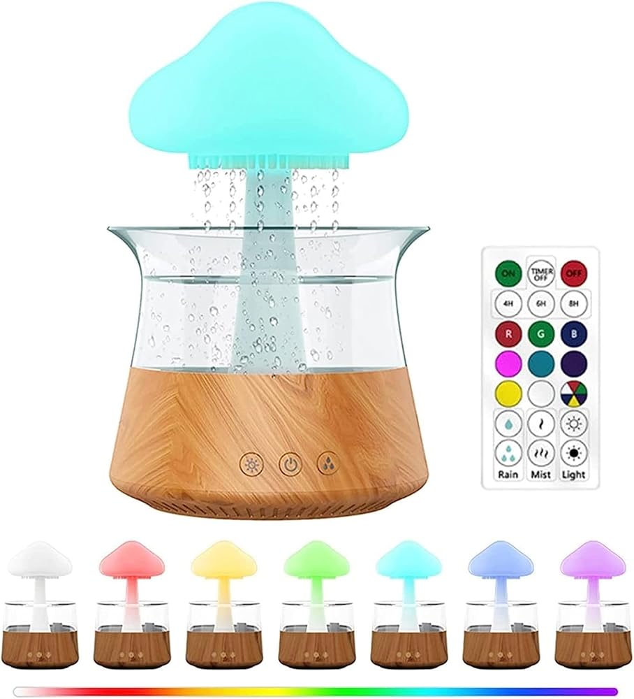 مصباح شلال مرطب للاسترخاء: يخلق مرطب الفطر جوًا مهدئًا مع جهاز محاكاة المطر الخاص به، مما يحاكي صوت المطر المهدئ. إنها أداة ممتازة للاسترخاء، مثالية للاسترخاء بعد يوم طويل.