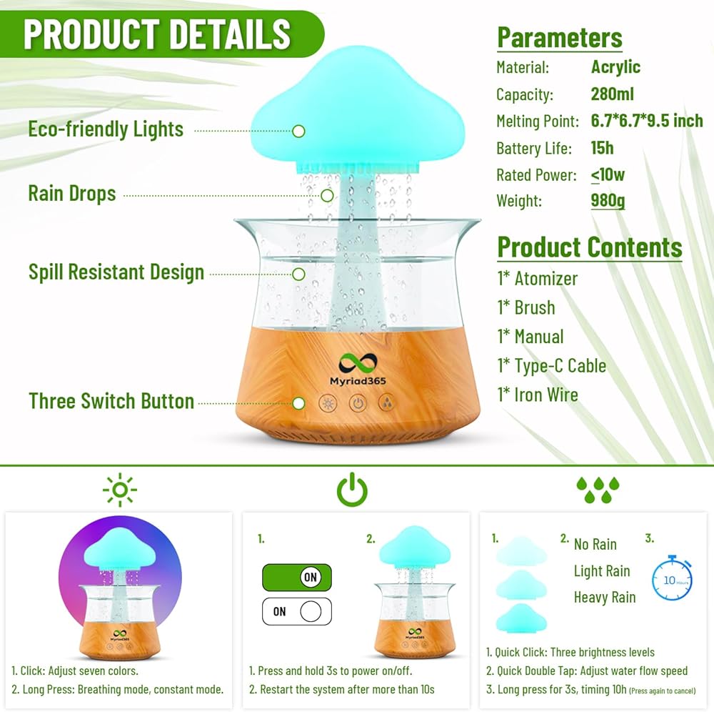 مرطب هواء ماي رياد 365 بإضاءة ليلية على شكل فطر وسحابة المطر: استمتع بأصوات قطرات الماء المهدئة لميزة تقطير الماء في سحابة المطر. مرطب المطر هذا مثالي لأولئك الذين يحبون النوم على صوت المطر اللطيف، مما يخلق جوًا هادئًا لغرفة النوم.
