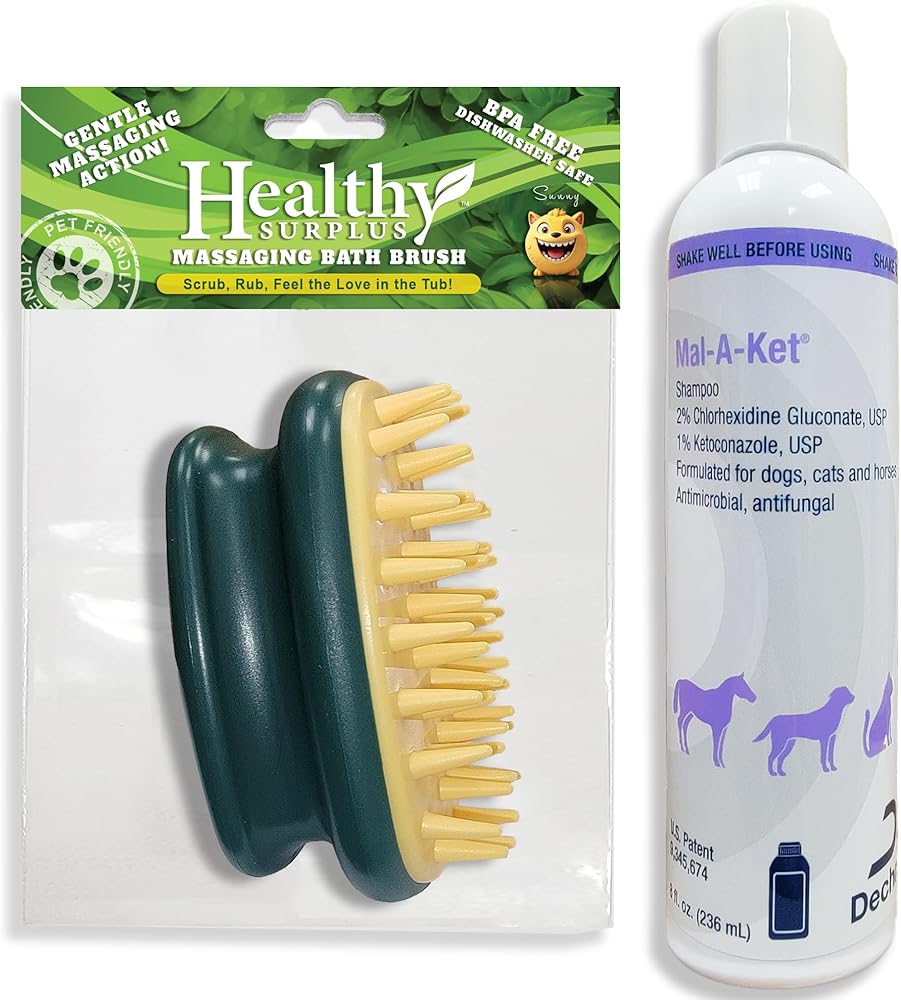 Healthy Surplus Massaging Pet Bath Brush and Dechra Malaket Dog, Cat, Pet and Animal Shampoo. Please be aware that Healthy Surplus and Dechra are separate entities without any affiliation. References to Dechra products or trademarks by Healthy Surplus are for informational purposes only and do not indicate endorsement or partnership.