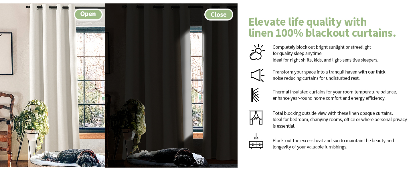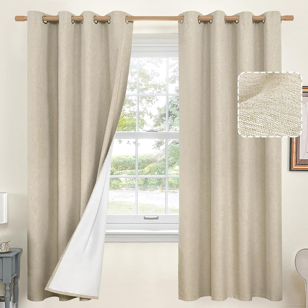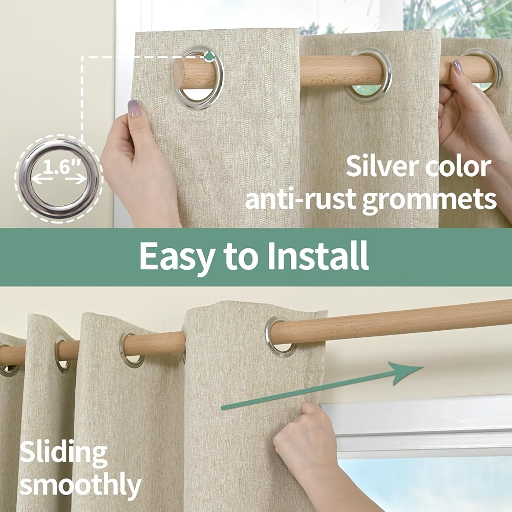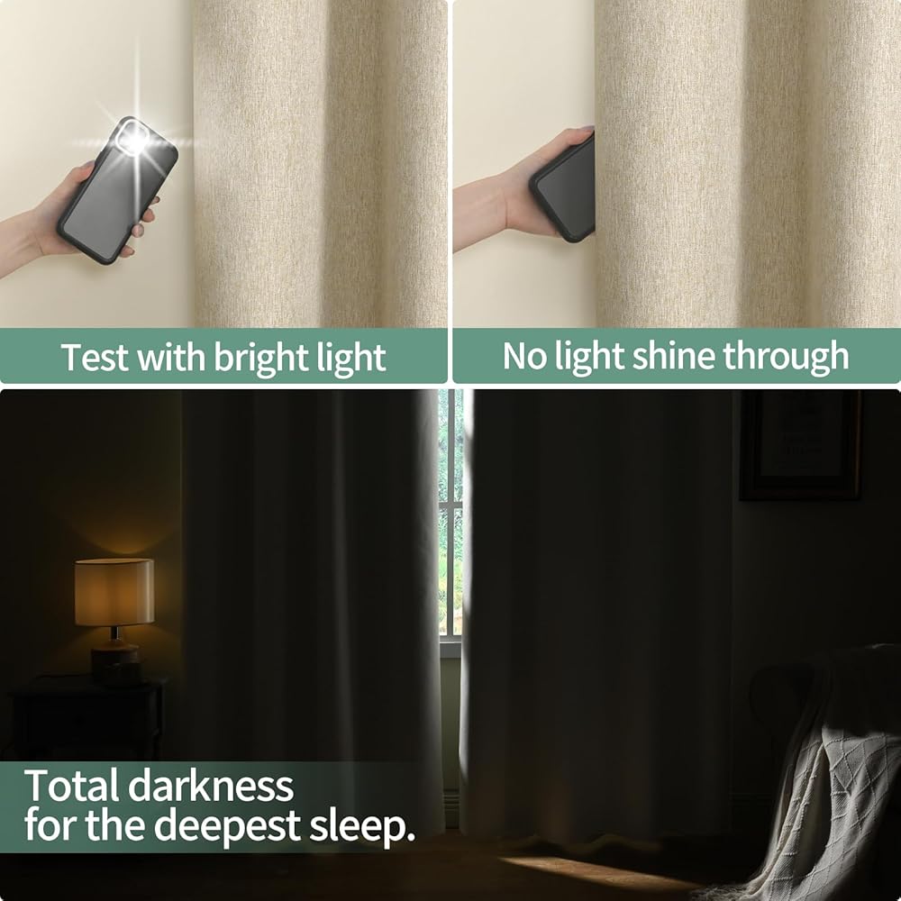 ستائر تعتيم كاملة: مع بطانة بيضاء على الظهر وقماش بمظهر الكتان في الأمام، تحجب ستائر غرفة النوم هذه بشكل فعال أشعة الشمس وإضاءة الشارع وتقلل الضوضاء، مما يخلق بيئة داكنة وهادئة وخصوصية لتحسين جودة النوم. مثالي للمناوبات الليلية أو الأطفال أو أولئك الذين لديهم حساسية للضوء والذين يعانون من مشاكل في النوم.