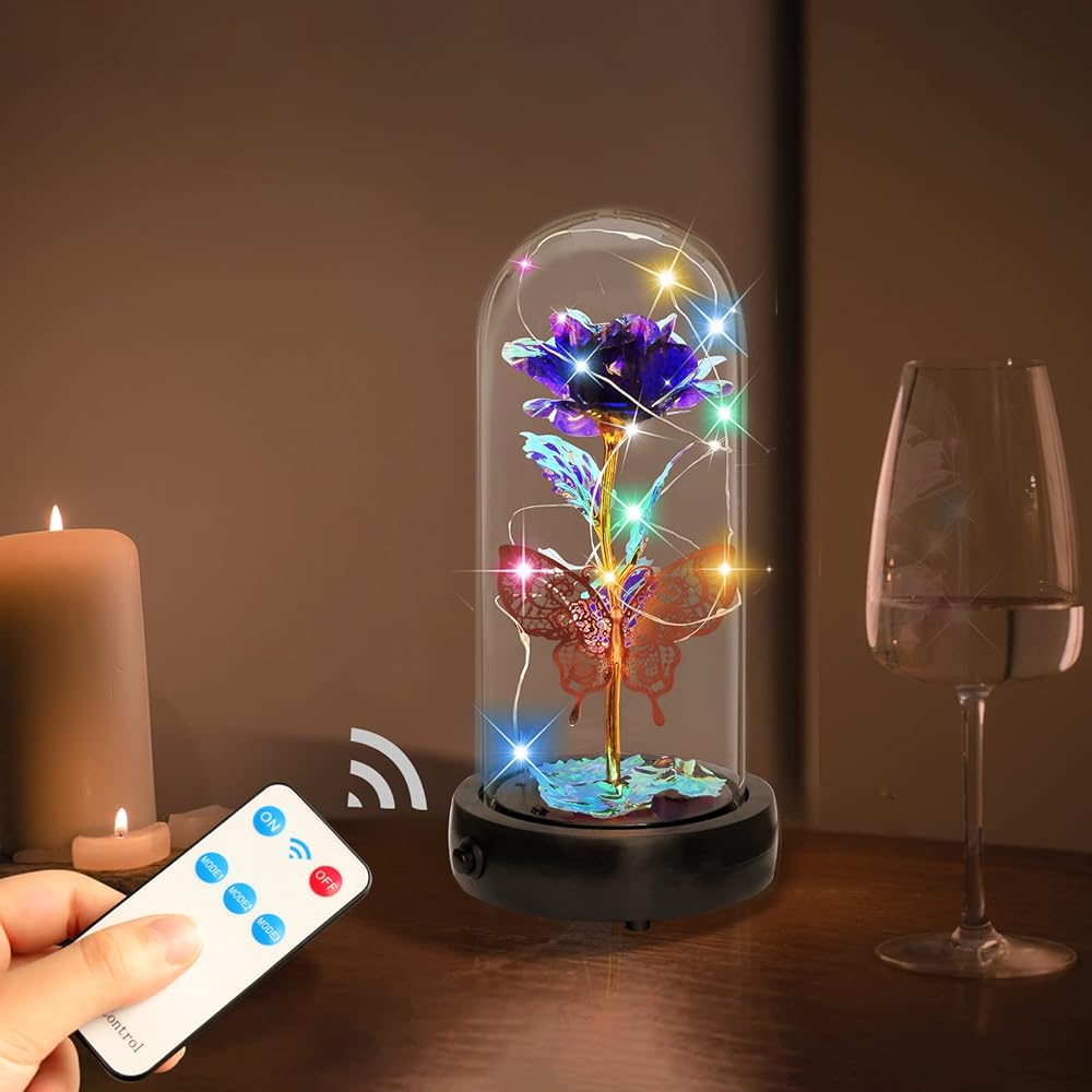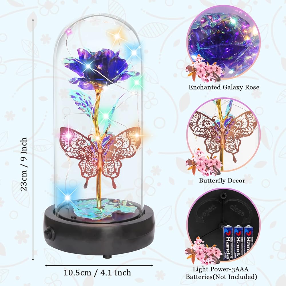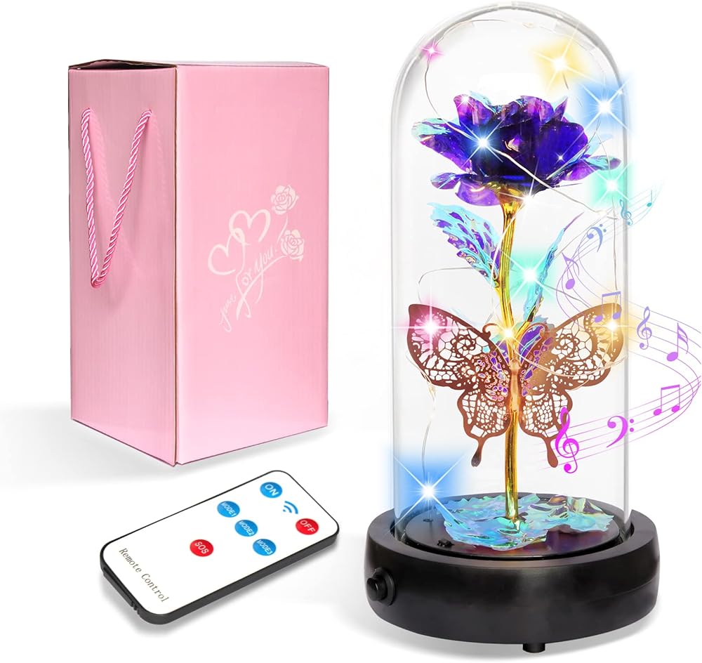 💝هدية وردة زجاجية أبدية في قبة زجاجية، ديكور فراشة + صندوق موسيقى + ضوء LED + جهاز تحكم عن بعد + حزمة هدية. 🎁 وردة صناعية للنساء المقاس: 4.1*9 بوصة (10.5*23 سم)