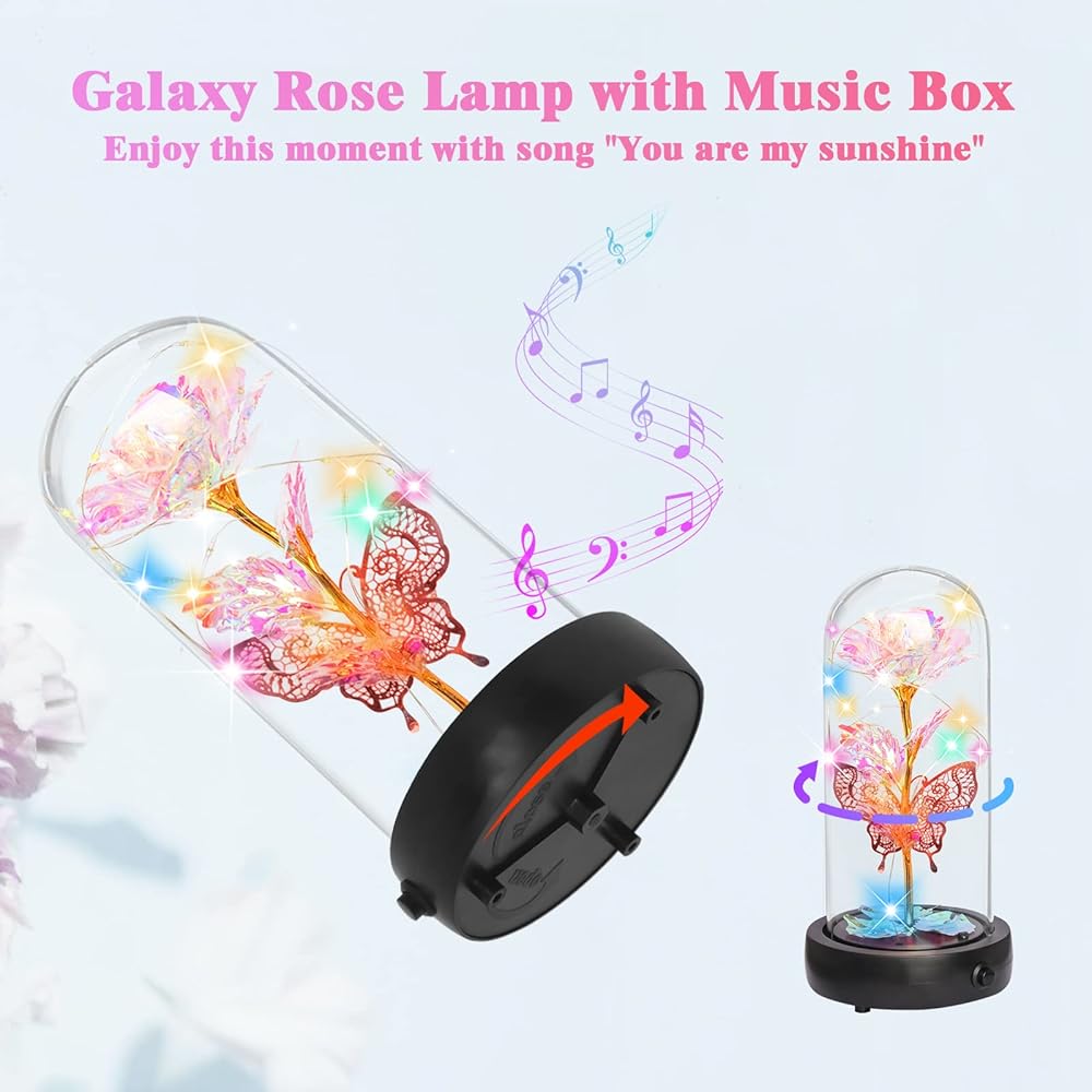 ☀ وردة زجاجية قوس قزح مع صندوق الموسيقى - تصميم فريد من نوعه في وردة الزهور المحفوظة لدينا: صندوق الموسيقى الدوار. قم بتشغيل القاعدة لتشغيل موسيقى رائعة دون الحاجة إلى بطاريات. الأغنية هي "أنت أشعة الشمس الخاصة بي"، استمتع بالموسيقى مع ضوء الفراشة الوردي الليلي، شارك هذه اللحظة الممتازة مع من تحب أو من تحب.