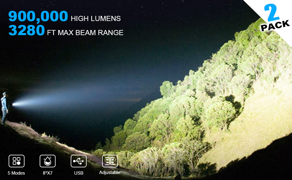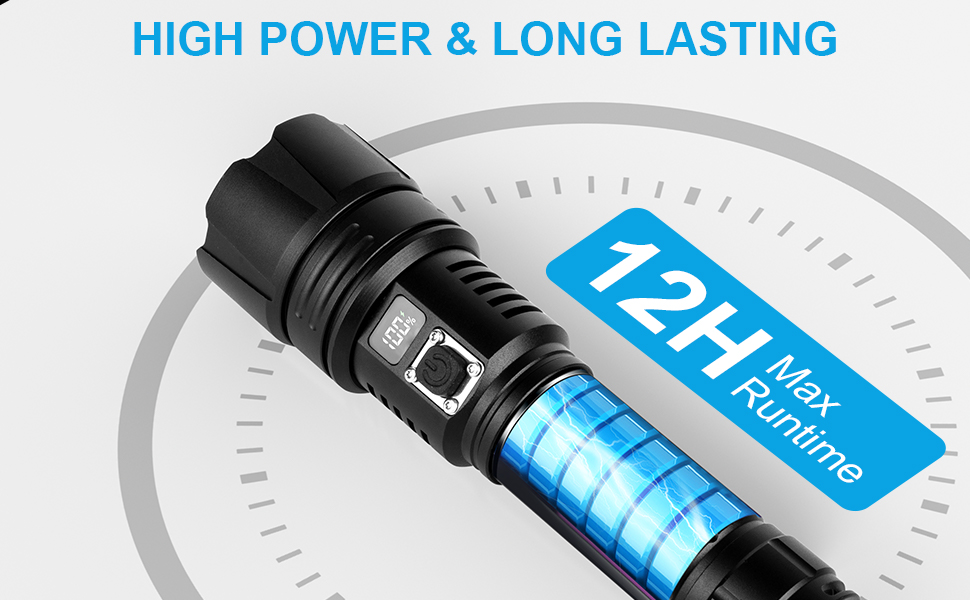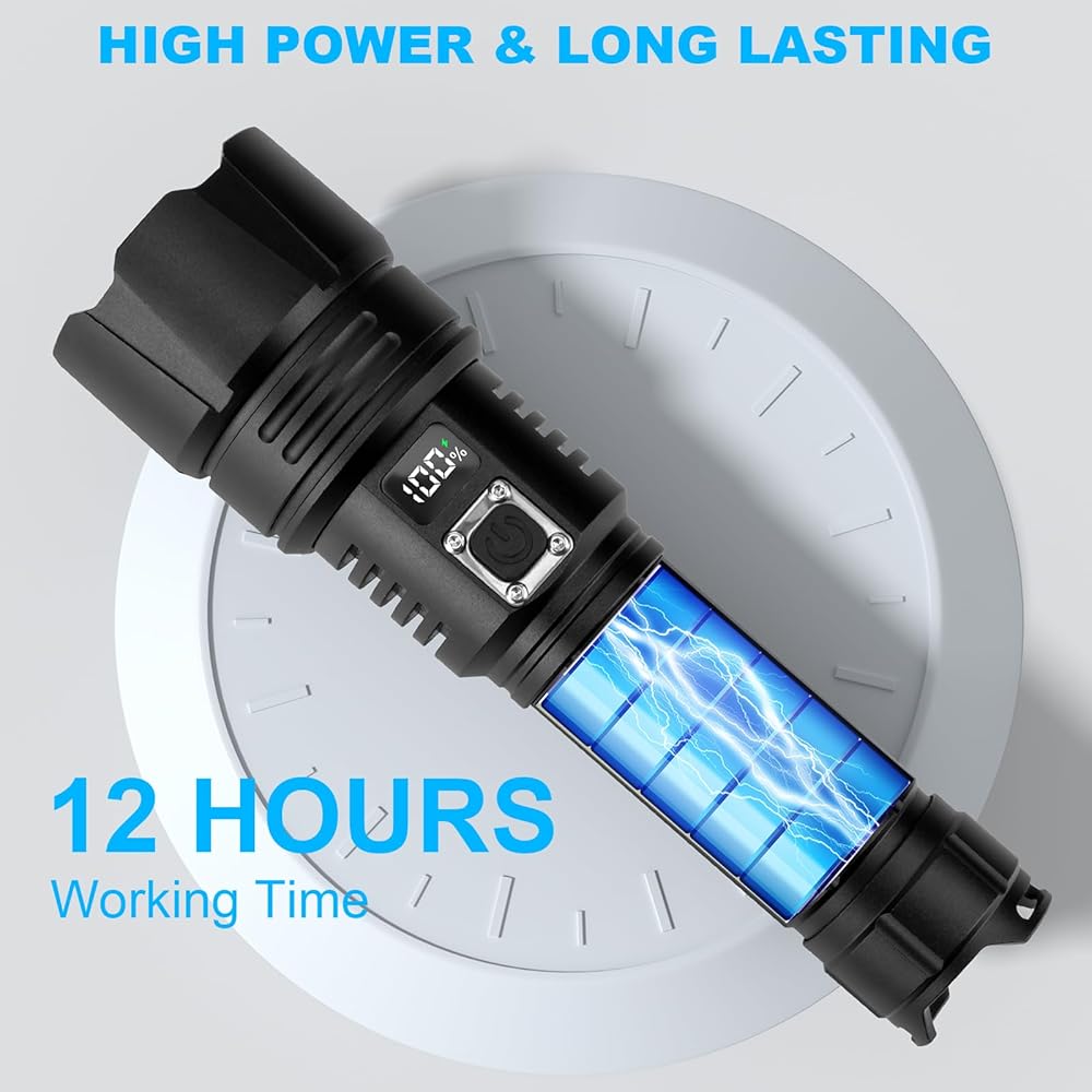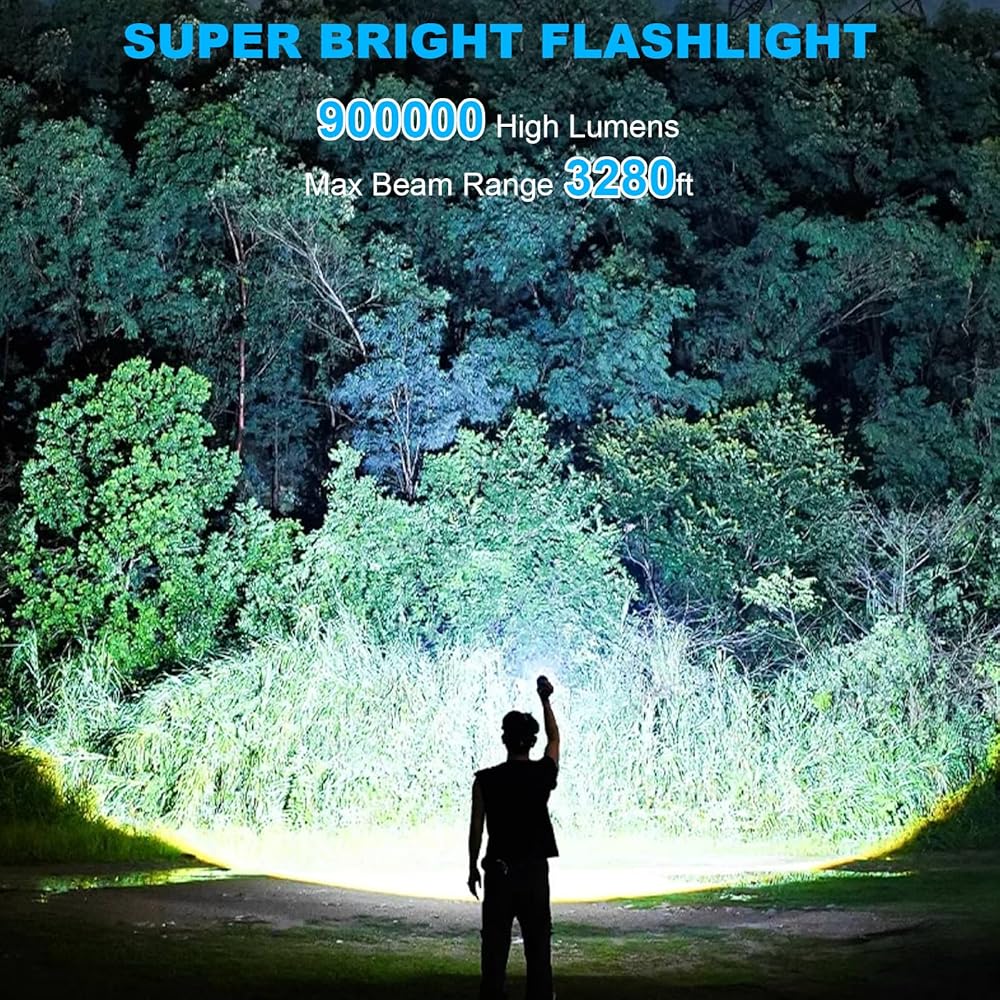 900000 لومن ساطع: مع رقاقة XHP90.8 LED المطورة، يضيء المصباح اليدوي عالي اللومن محيطك بإخراج 900000 لومن مثير للإعجاب ومسافة إضاءة قصوى تبلغ 3280 قدمًا. سواء كنت تقوم بالتخييم أو التنزه سيرًا على الأقدام أو أي أنشطة خارجية أخرى، فإن مصباحنا اليدوي فائق السطوع سيوفر الإضاءة الموثوقة التي تحتاجها.