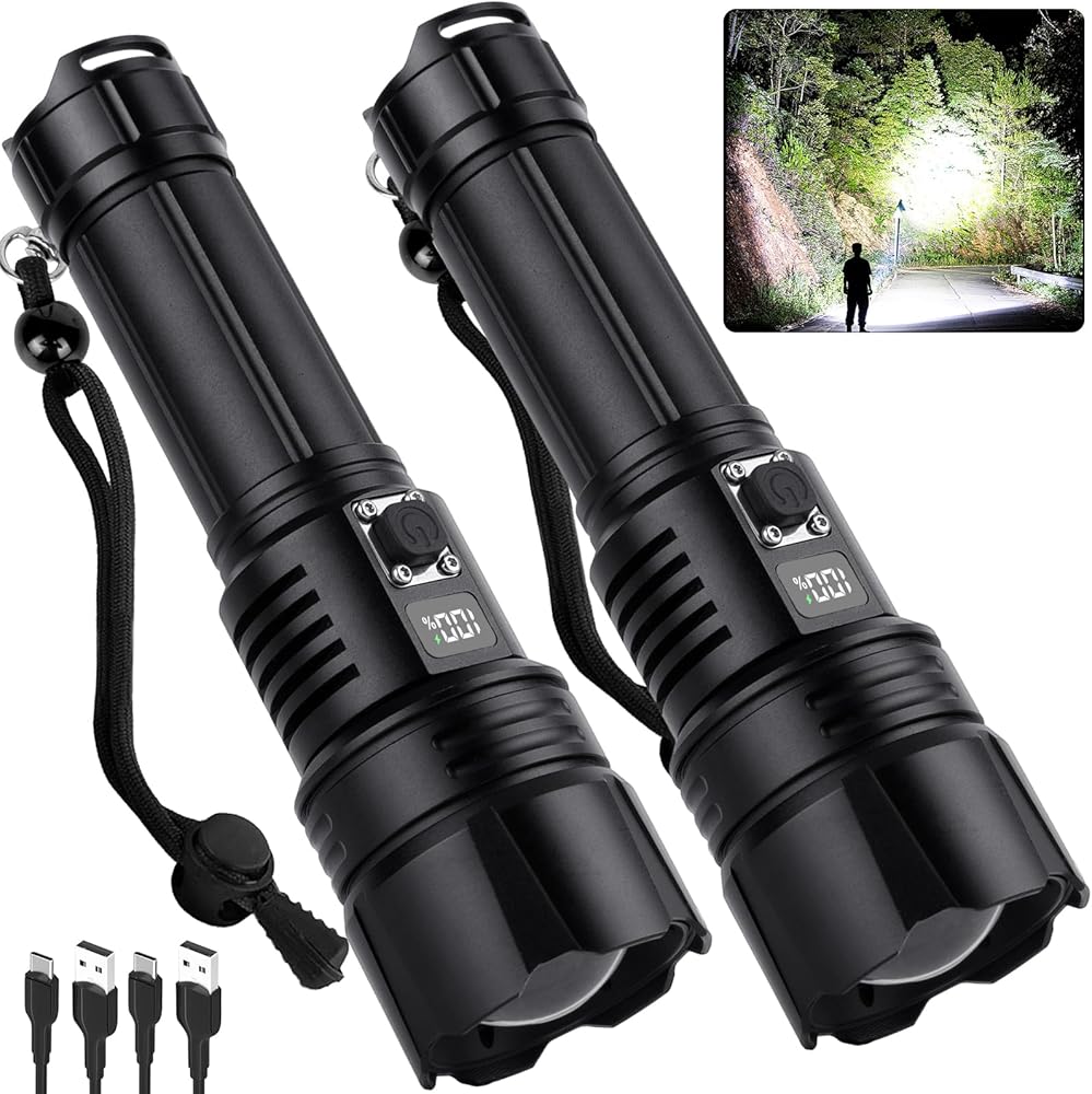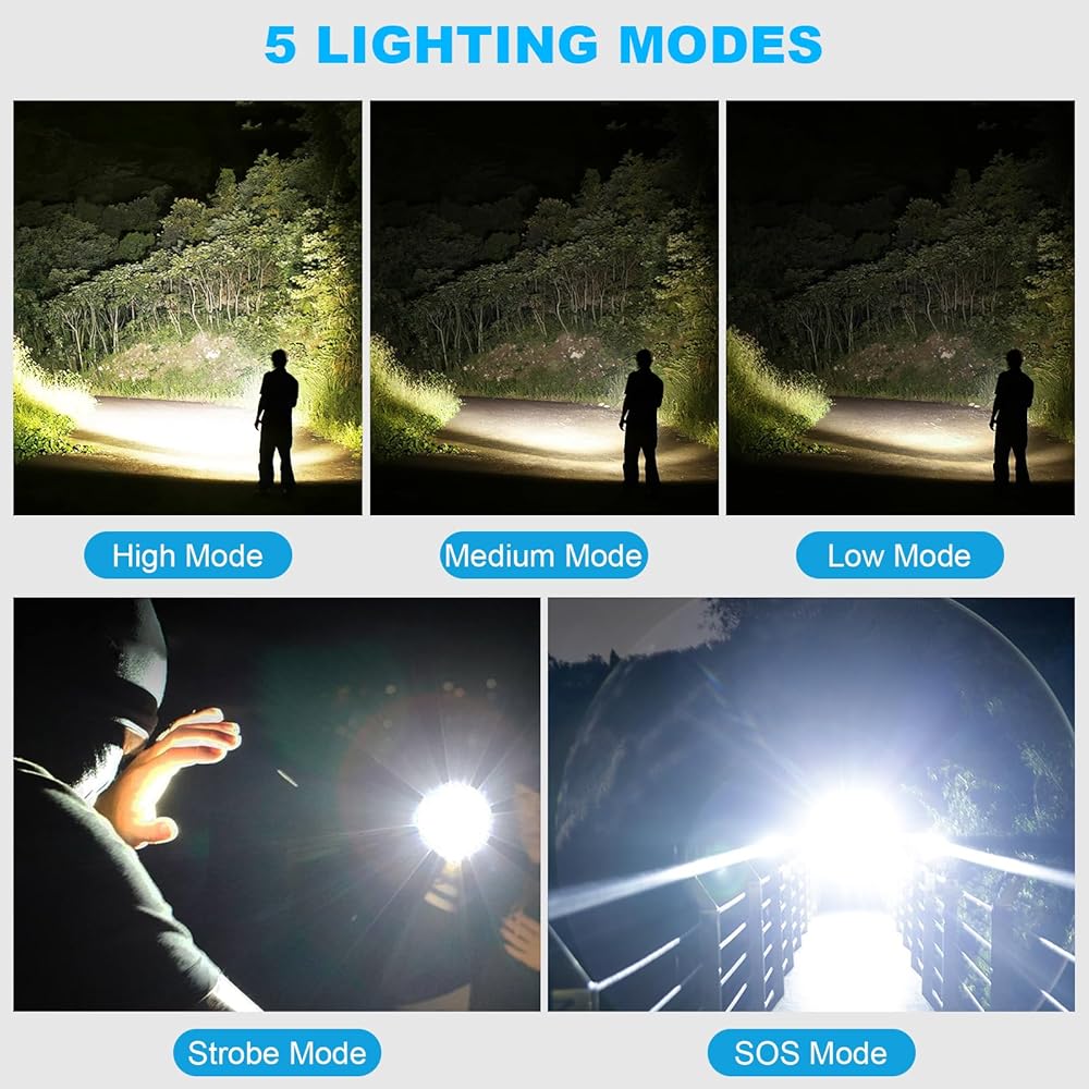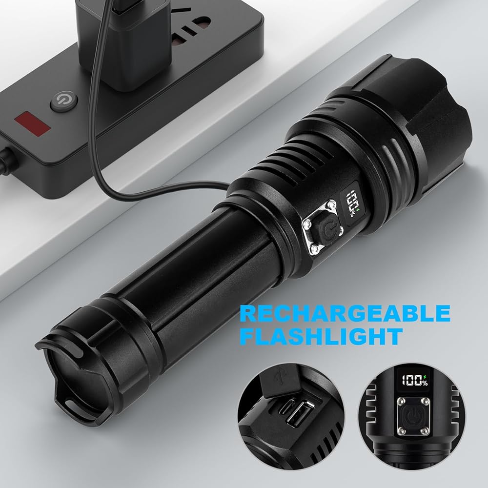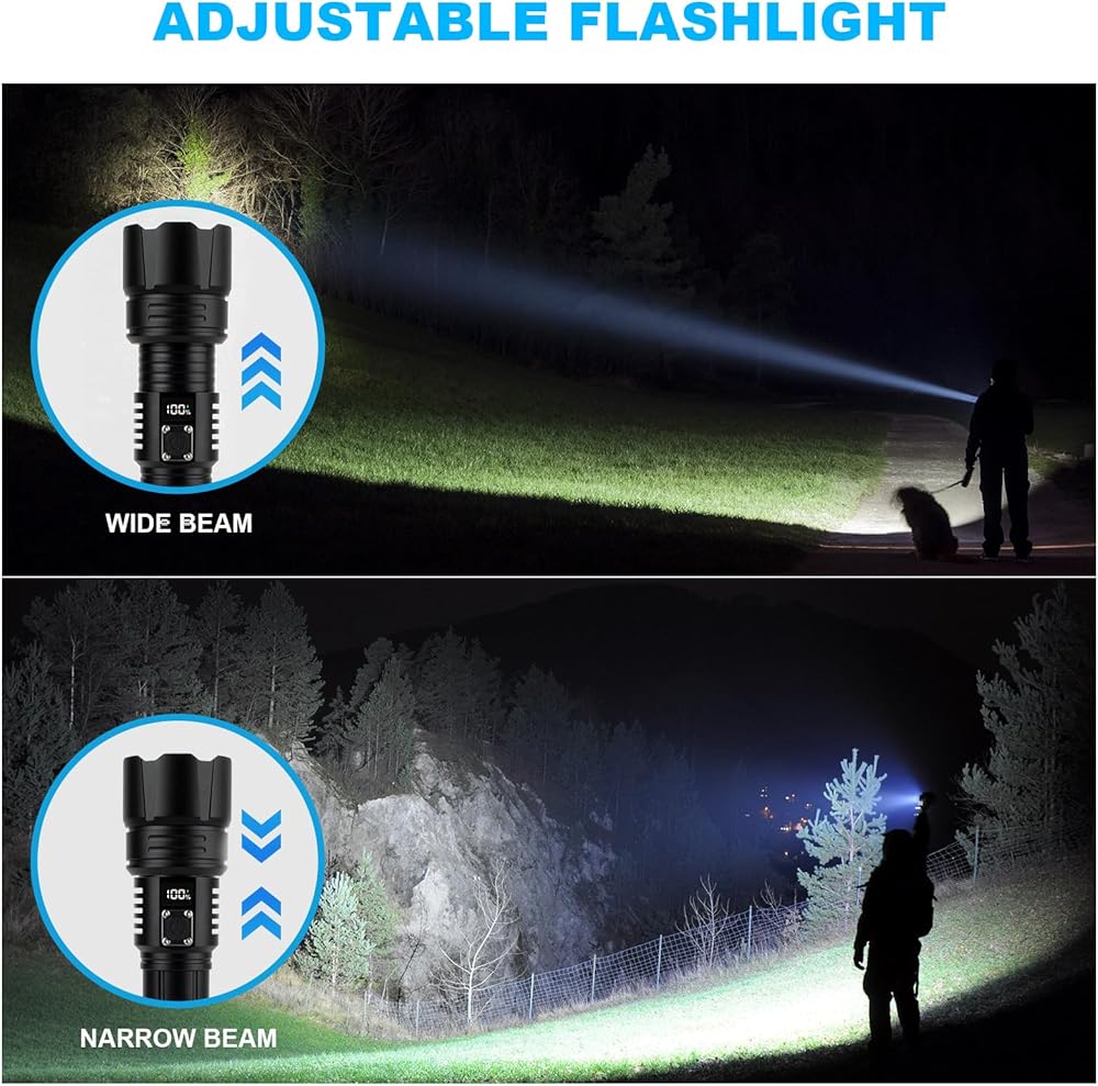 900000 لومن ساطع: مع رقاقة XHP90.8 LED المطورة، يضيء المصباح اليدوي عالي اللومن محيطك بإخراج 900000 لومن مثير للإعجاب ومسافة إضاءة قصوى تبلغ 3280 قدمًا. سواء كنت تقوم بالتخييم أو التنزه سيرًا على الأقدام أو أي أنشطة خارجية أخرى، فإن مصباحنا اليدوي فائق السطوع سيوفر الإضاءة الموثوقة التي تحتاجها.