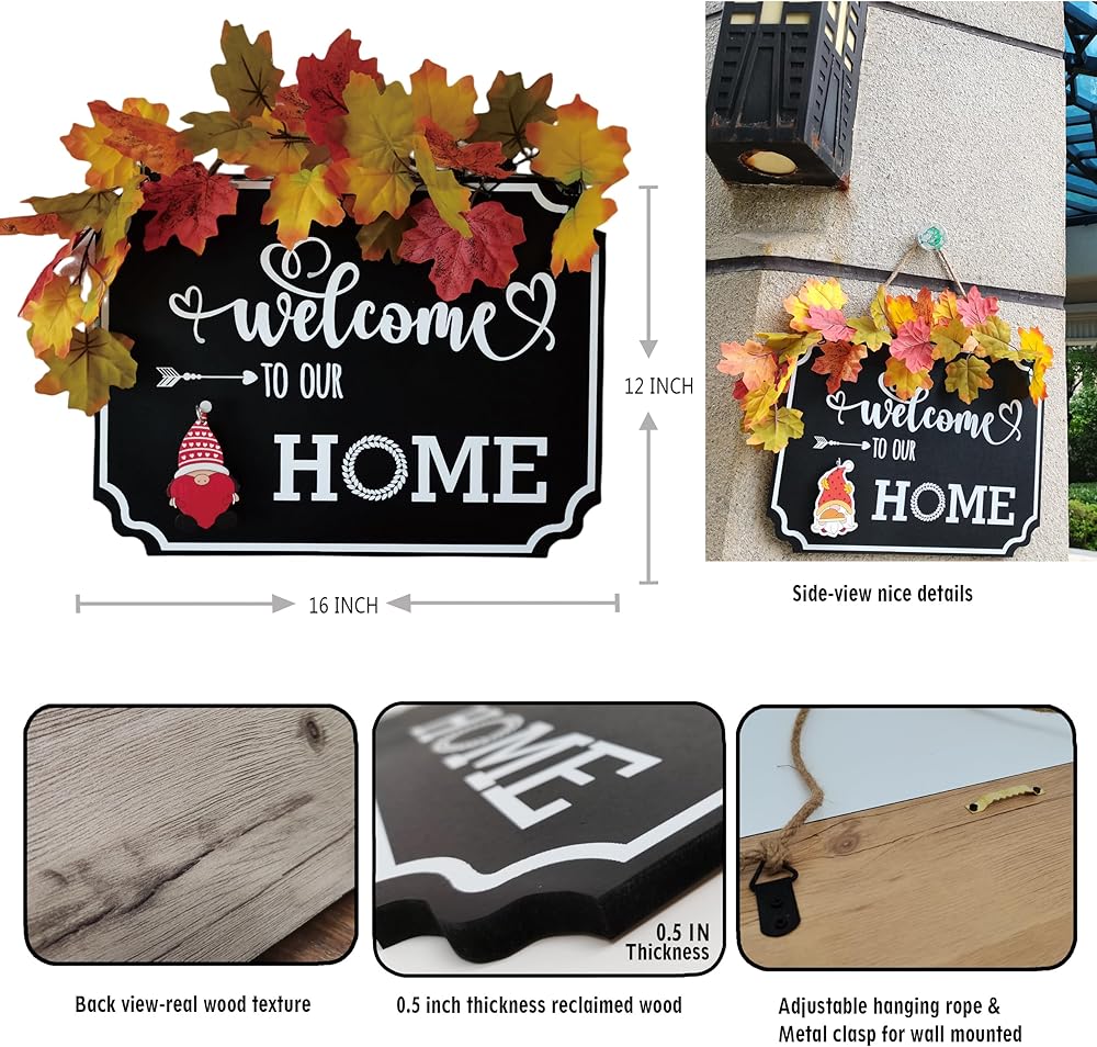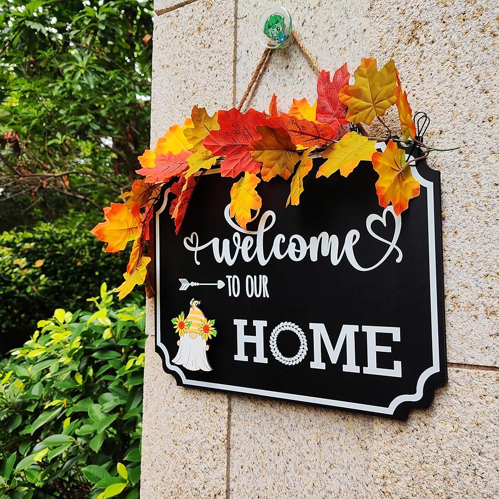 🏠【علامة ترحيب منزلية سميكة】تختلف عن لافتة الترحيب الصغيرة الأخرى ذات الأبواب الرقيقة، لافتة الترحيب الكبيرة القابلة للتبديل تستخدم الخشب المستصلح بسمك 12 مم، أكثر متانة وثباتًا. تصميم فتحة تعليق محسّنة لضمان عدم سقوط قطعة القزم بفعل الرياح.