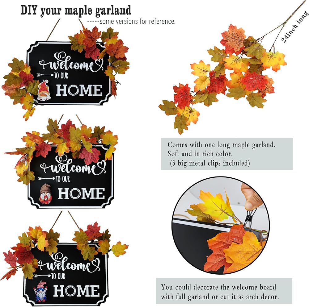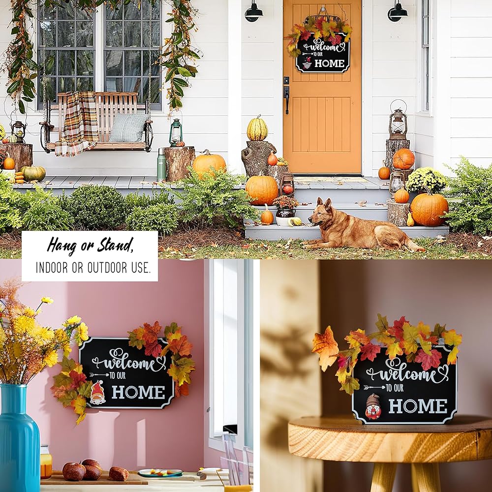 🍁【إكليل DIY】بدلاً من اللافتة الخشبية الترحيبية الأخرى مع إكليل متناثر ثابت، تتضمن علامة الترحيب هذه في منزلنا إكليل طويل كثيف من أوراق القيقب يمكنك تركيبه بنفسك في شكل مختلف حسب رغبتك، مما يوفر لك المزيد من الخيارات لتزيين الشرفة الأمامية .