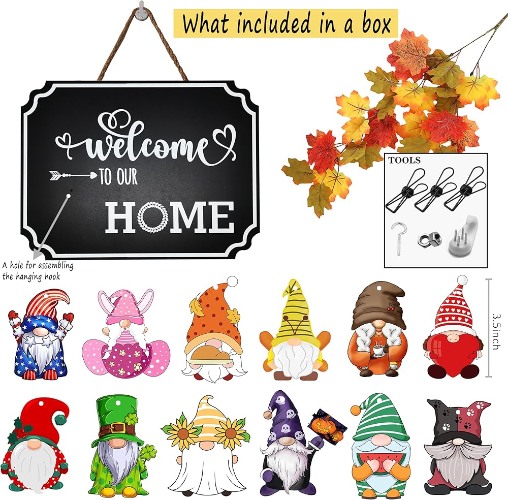 🧙【علامة ترحيب قابلة للتبديل】تأتي علامة الترحيب الموسمية مع 12 قزمًا للعطلات قابلة للتبديل، يمكنك أخذ أيقونات مختلفة لتغيير ديكور الباب الأمامي في كل عطلة للإدلاء ببيانات بأسلوبك الخاص.