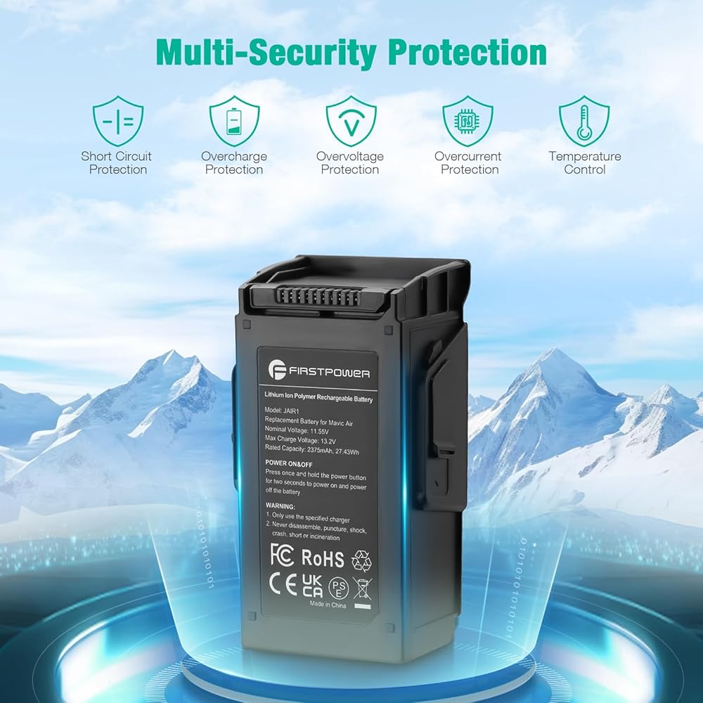 【حماية متعددة للسلامة】خضعت بطارية FirstPower Mavic Air لاختبارات وشهادات متعددة. وهي مجهزة بوسائل حماية متعددة مثل التفريغ الذاتي، والشحن الزائد، والجهد الزائد، وارتفاع درجة الحرارة، وحماية الدائرة القصيرة لضمان عدم حدوث أي مشاكل أثناء الاستخدام.