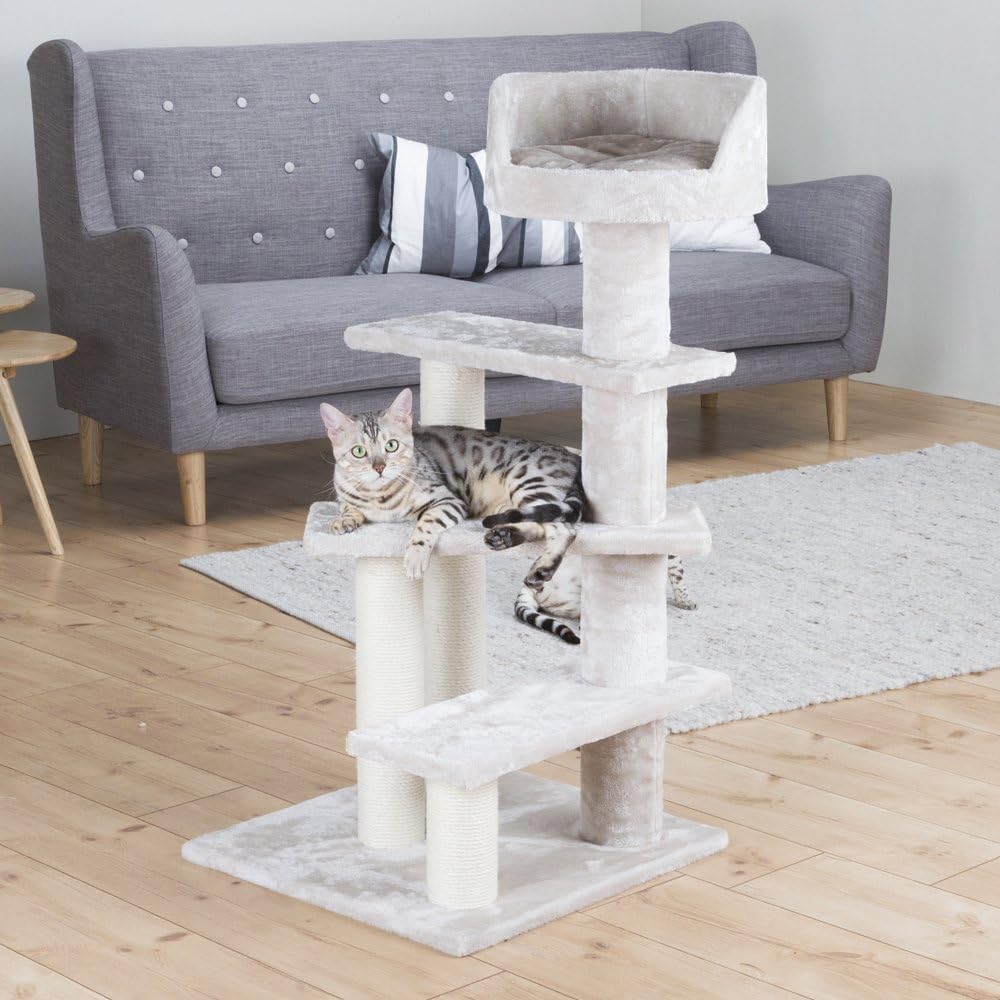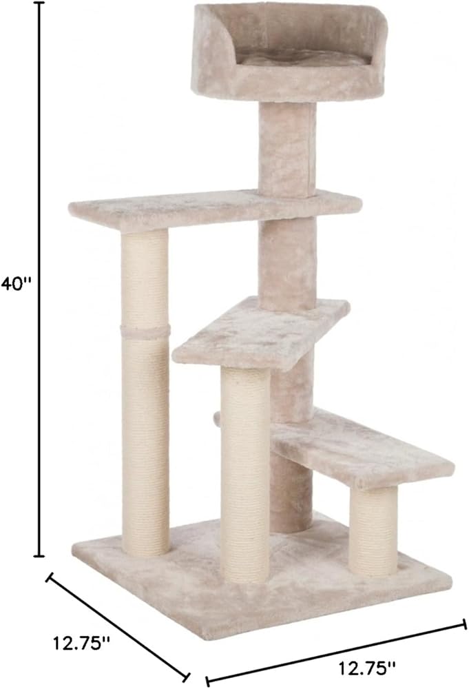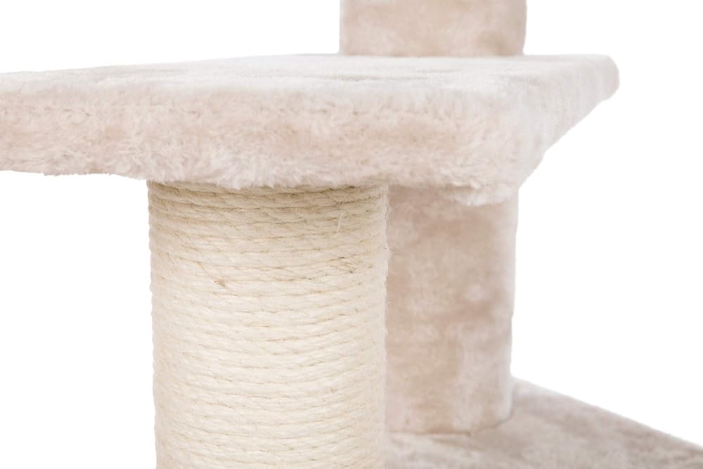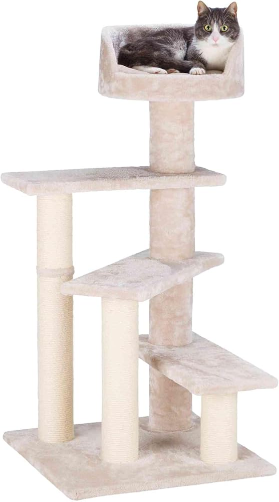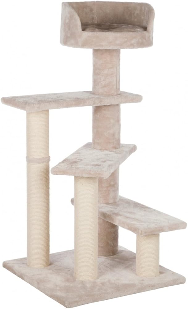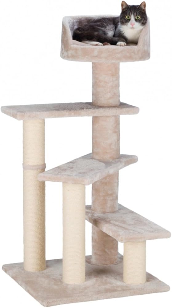 The TRIXIE Tulia Senior Cat Tree is ideal for older, mature felines who still want to perch and play. Covered in super soft plush fabric, this sturdy cat tree has three platforms aligned as steps that lead up to a cozy bed with supportive backrest for added comfort. Your sweet kitty will fall fast asleep as she sinks into the soft plush, making it the perfect retreat. Cats can sharpen their claws on any of the jute covered scratching posts instead of on your furniture or carpet, giving them a healthy outlet for their scratching instincts. Feeling a little spunky? Jump, climb or perch atop of the covered platforms and lie in wait for unsuspecting prey or simply enjoy the view. The subtle fresh tones of the sisal and plush fabric also make this piece of cat furniture easy to integrate into your home decor.