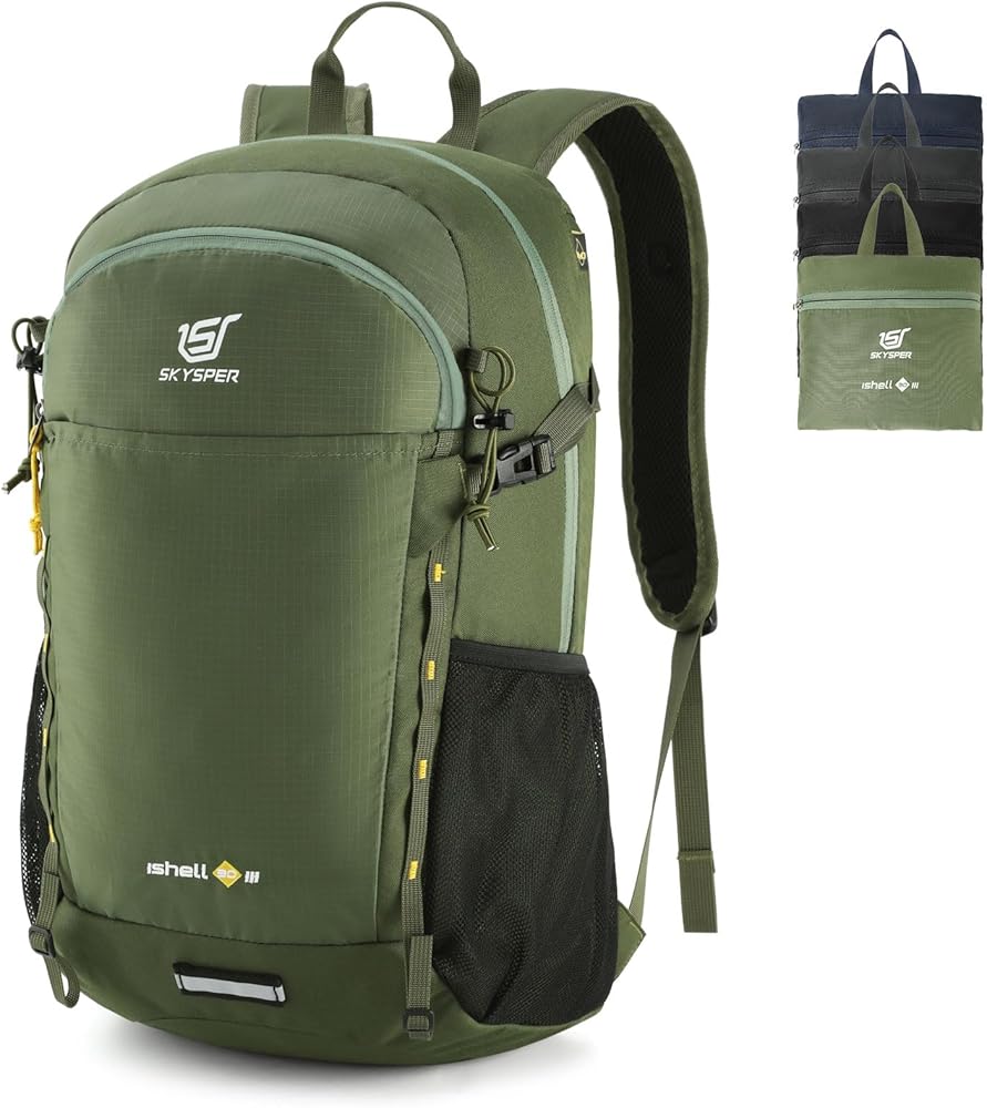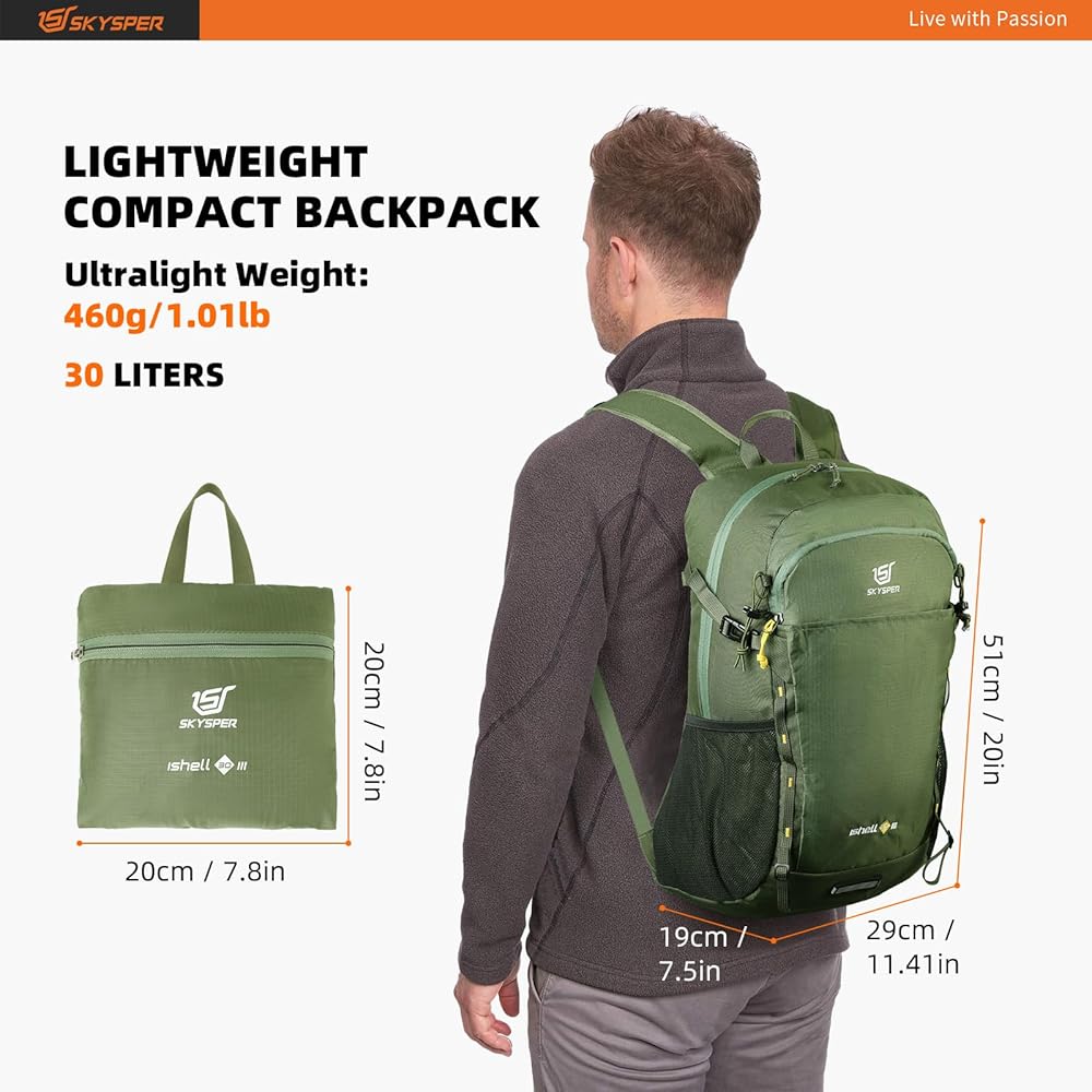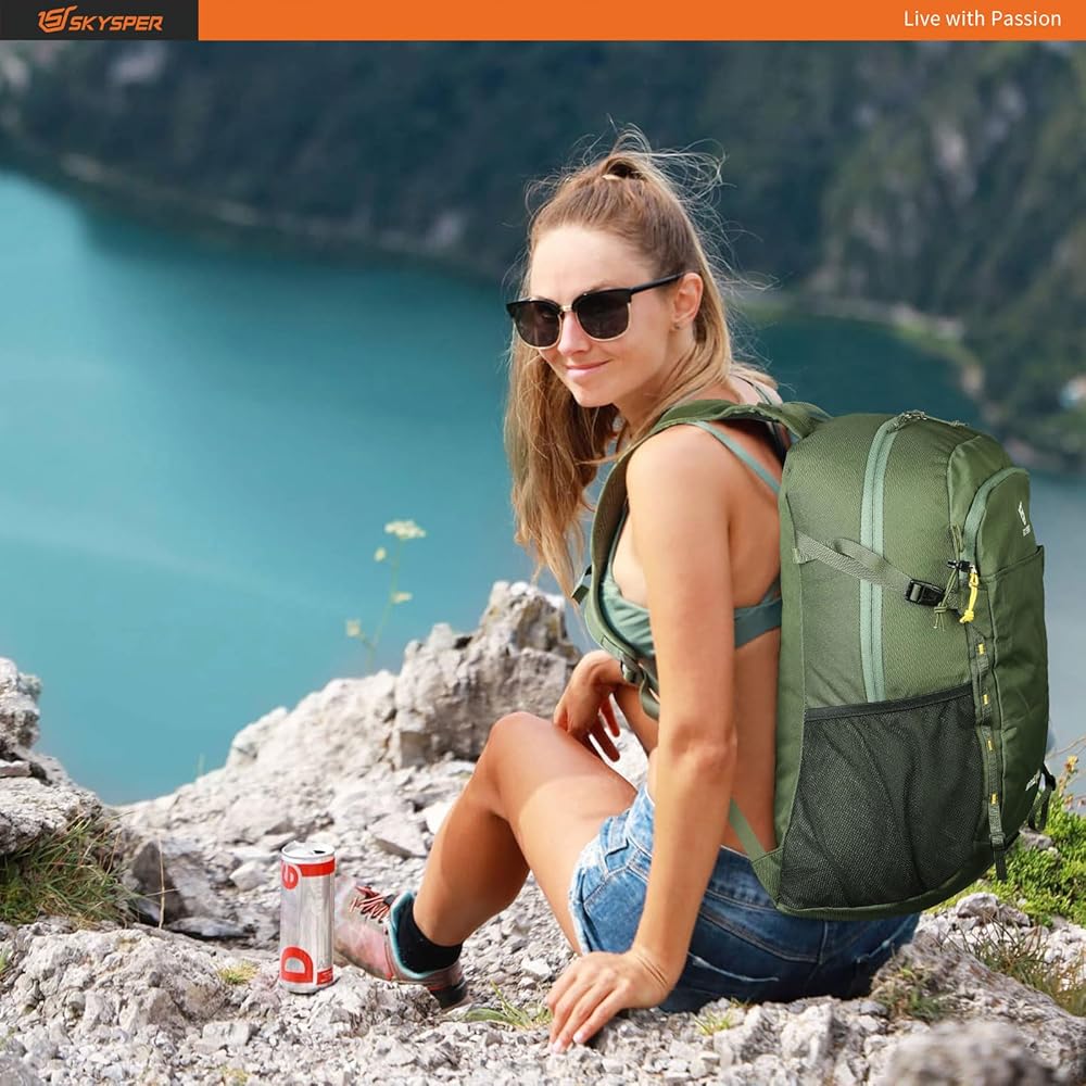 حقيبة ظهر SKYSPER للمشي لمسافات طويلة سعة 30 لتر خفيفة الوزن وقابلة للتعبئة أثناء السفر حقيبة نهارية مقاومة للماء للمشي لمسافات طويلة للنساء والرجال (ArmyGreen)