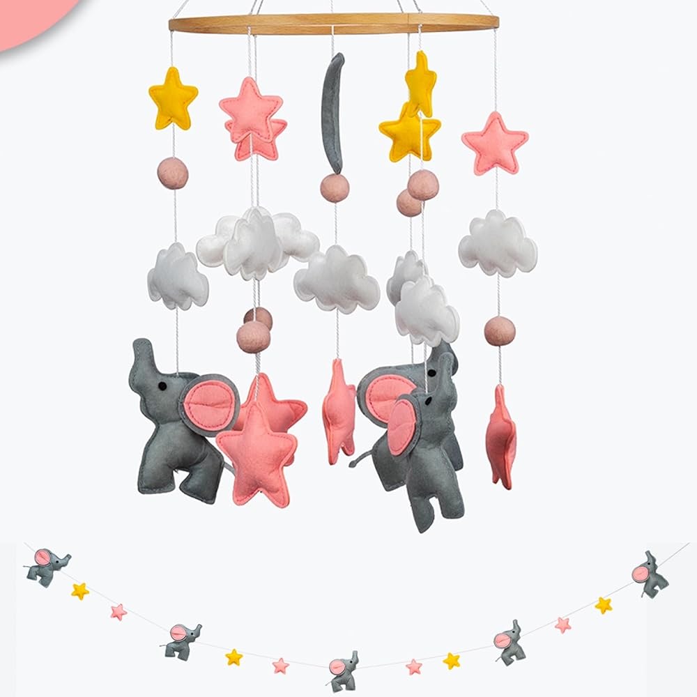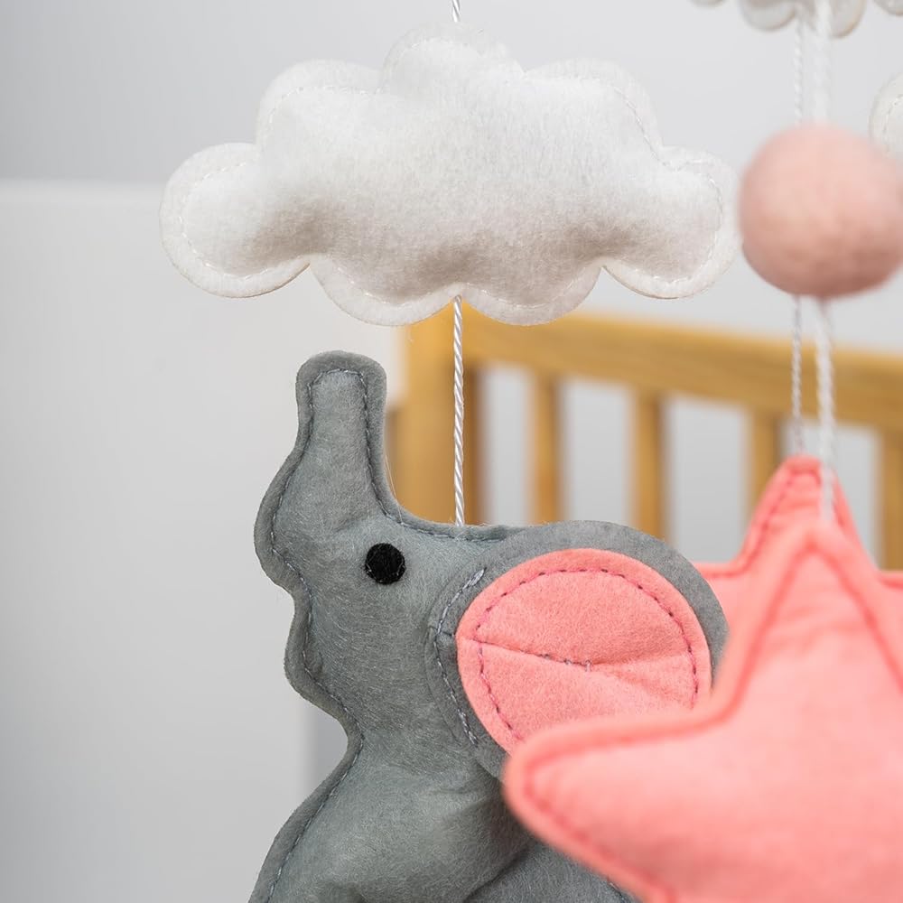 Let your baby's life adventure begin with this beautiful elephant nursery décor set! With one elephant baby mobile and also a matching elephant nursery decor garland. With many felt pieces your baby will be intrigued by the shapes and colors while the gentle spinning of the mobile will help them drift off into a peaceful sleep. Use the elephant décor to inspire stories about Dumbo and the circus! This beautiful nursery decor set will brighten any baby girl nursery.