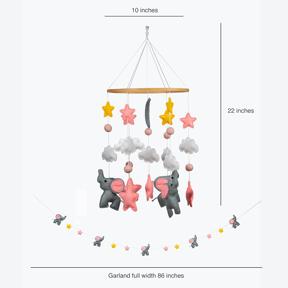 Two decorations - A pink and gray elephant baby mobile for crib with matching elephant nursery decor felt garland