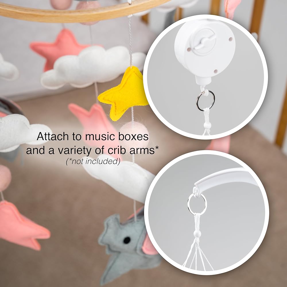 Universal - hang from a variety of crib mobile arms (not included) or hang from a variety of musical spinning crib mobile attachments (not included) or give a gentle spin by hand