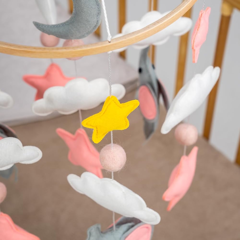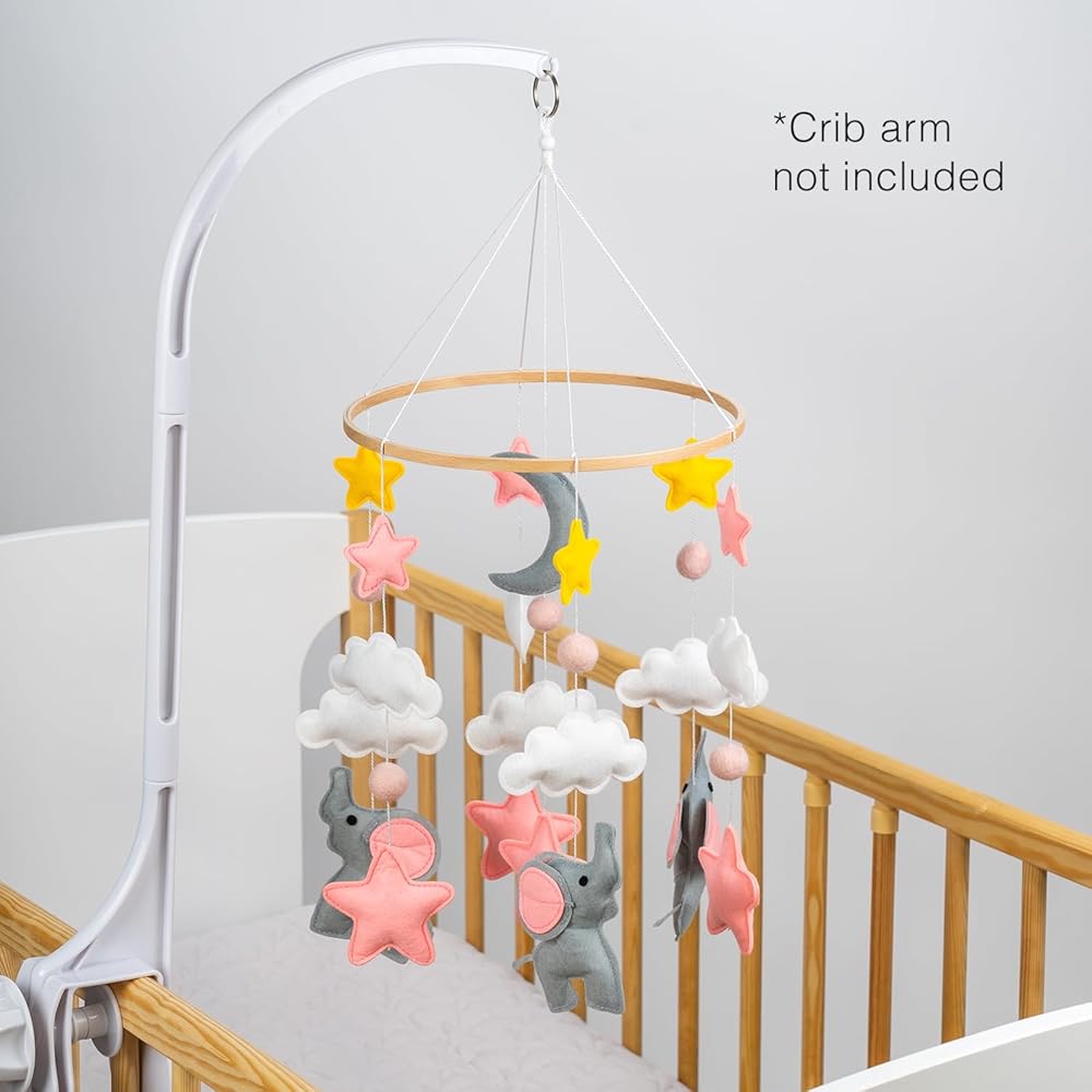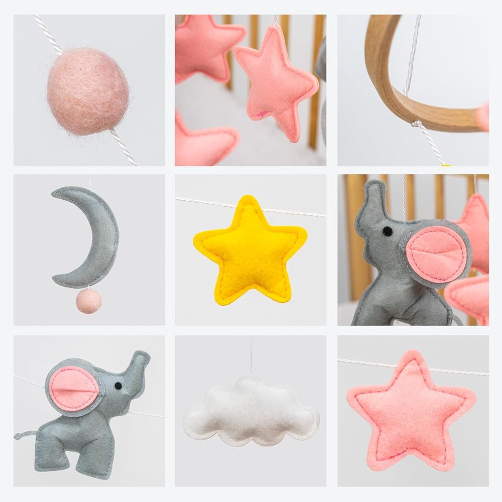 Girl elephant mobile - soft shades of pink and bright yellow stars make this a beautiful elephant crib mobile for girls