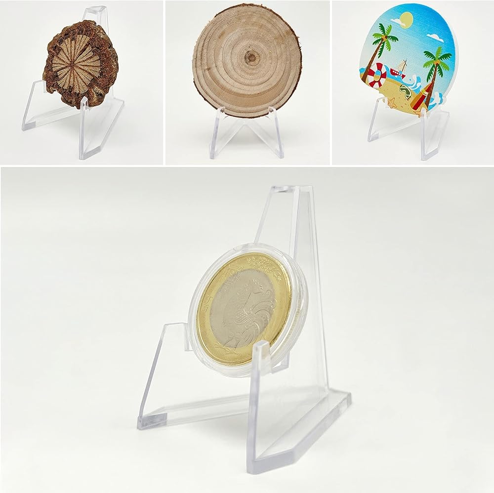 مقاس حامل العملات المعدنية (العرض × الارتفاع) - 2.1 انش × 2.1 انش، حجم صغير وخفيف الوزن، سهل التخزين والحمل؛ حامل حامل صغير شفاف يناسب قطعة بقطر أقل من 4 انش ووزن أقل من 200 غرام قبل وضعه على حامل الحامل.