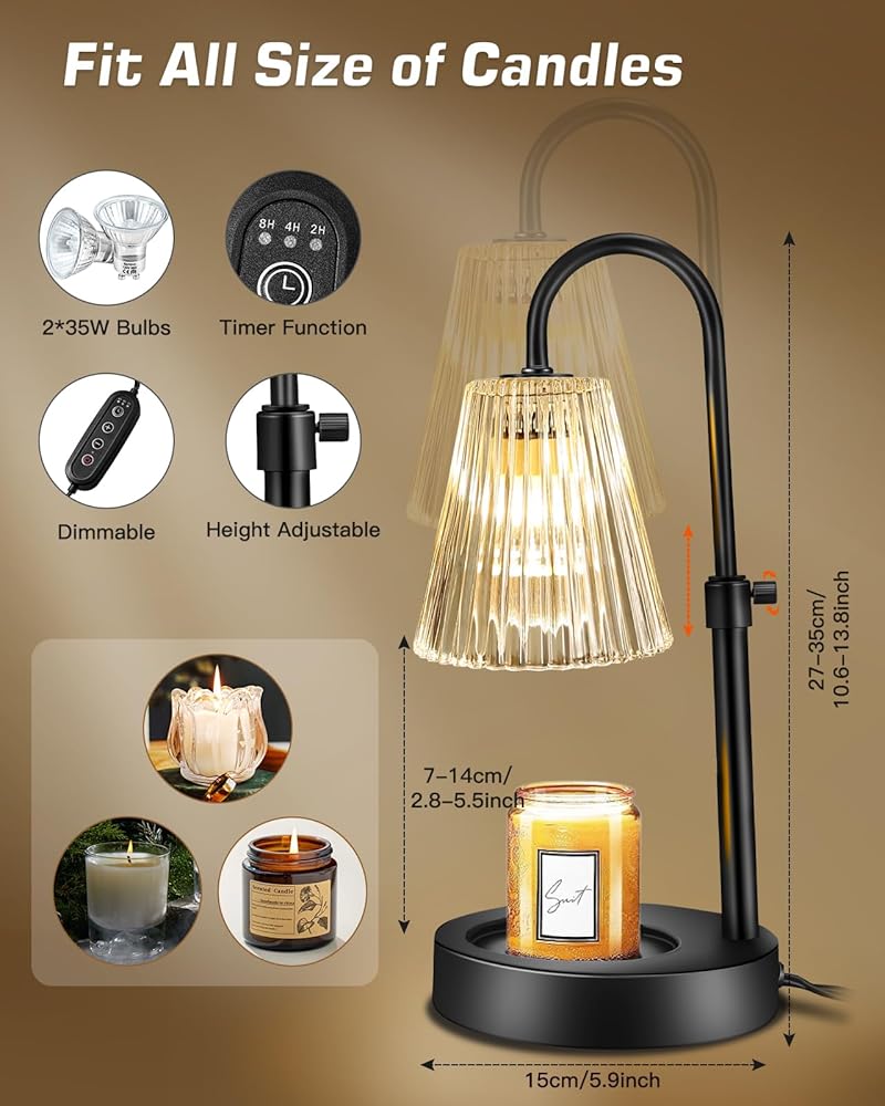 • يناسب جميع أحجام الشموع: يوفر سخان الشموع الخاص بنا ارتفاعًا قابلاً للتعديل، يتراوح من 10.6 إلى 13.8 بوصة، لاستيعاب الشموع ذات الأحجام المختلفة. تتيح لك هذه الميزة التحكم في درجة حرارة تدفئة الشمعة نظرًا لأن قرب المصباح الكهربائي من الشمعة يؤثر على شدة الحرارة. بالإضافة إلى ذلك، يتميز المصباح بقاعدة مقاس 5.9 بوصة، مما يضمن التوافق مع الشموع ذات الأحجام المختلفة.