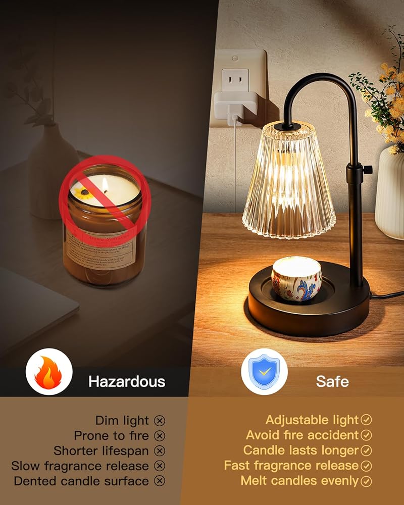 • آمن وآمن: مع مصباحين بقدرة 35 وات، يوفر مصباح تسخين الشموع الكهربائي هذا طريقة آمنة لتسخين الشموع. فهو يسخن ويذيب سطح الشمعة المعطرة بالتساوي من أعلى إلى أسفل، مما يقلل بشكل كبير من خطر مخاطر الحريق. هذا التصميم يلغي الحاجة إلى اللهب المكشوف، وبالتالي القضاء على الدخان والسخام والتلوث. إن استخدام سخان الشموع هذا يبقيك بعيدًا عن المواد الخطرة، مما يجعله خيارًا ممتازًا لكل من الاستدامة والسلامة.