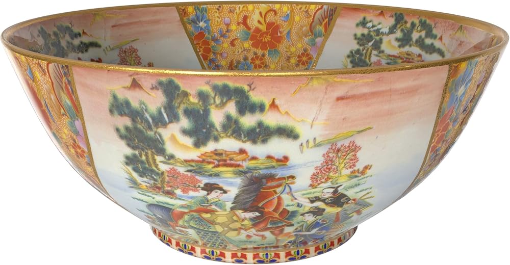 Satsuma Design: Meticulously hand-painted with intricate scenes showcasing vibrant landscapes, colorful flowers, and majestic peacocks. The rich color palette and delicate gold accents celebrate the artistry and heritage of the Far East.