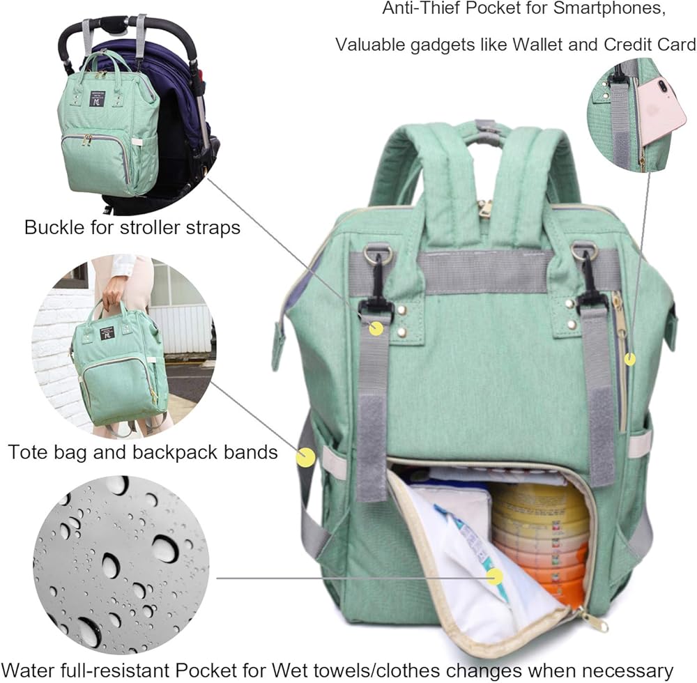 • Upgrade Diaper Bag for Handy Convenience - Waterproof by external advanced Oxford fabric & interior nylon fabric,easy to wipe clean after use even under rain.Insulated Pockets can hold most of wide neck baby bottles and help keep the temperature.Elastic side pockets for wide sippy cups or adult bottles.Keychain band inside for your keys.Large inner space to organize your stuffs,separate dry and wet.Hands free backpack.Handy top handle for use as Tote.Stroller straps for Strollers
