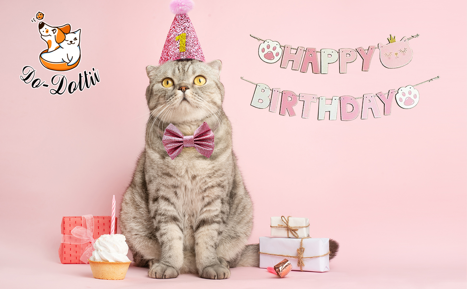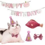 Do-Dottii Cat Kitten Kitty قبعة عيد ميلاد قبعة ربطة عنق على شكل فيونكة للقطط عيد ميلاد سعيد راية ألعاب لوازم الحفلات ديكورات ملابس قطة صغيرة النعناع البري مضغ ألعاب ركلة لفتاة القط (وردي)