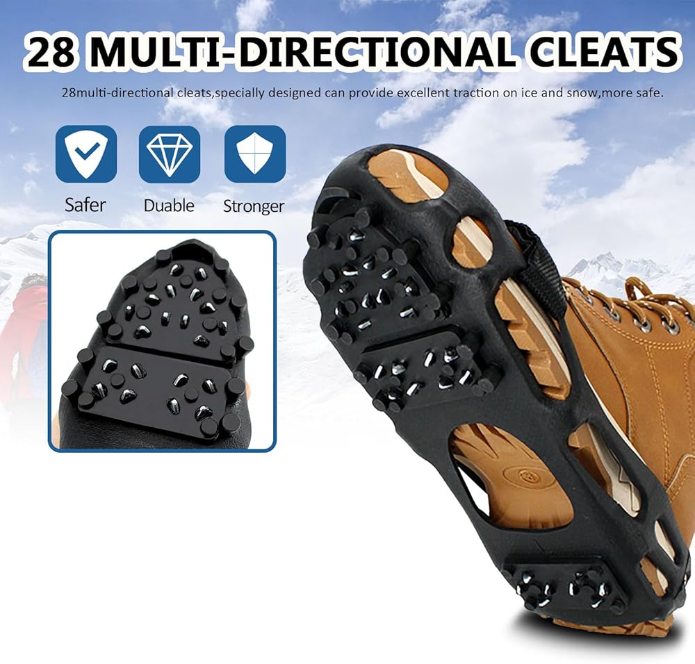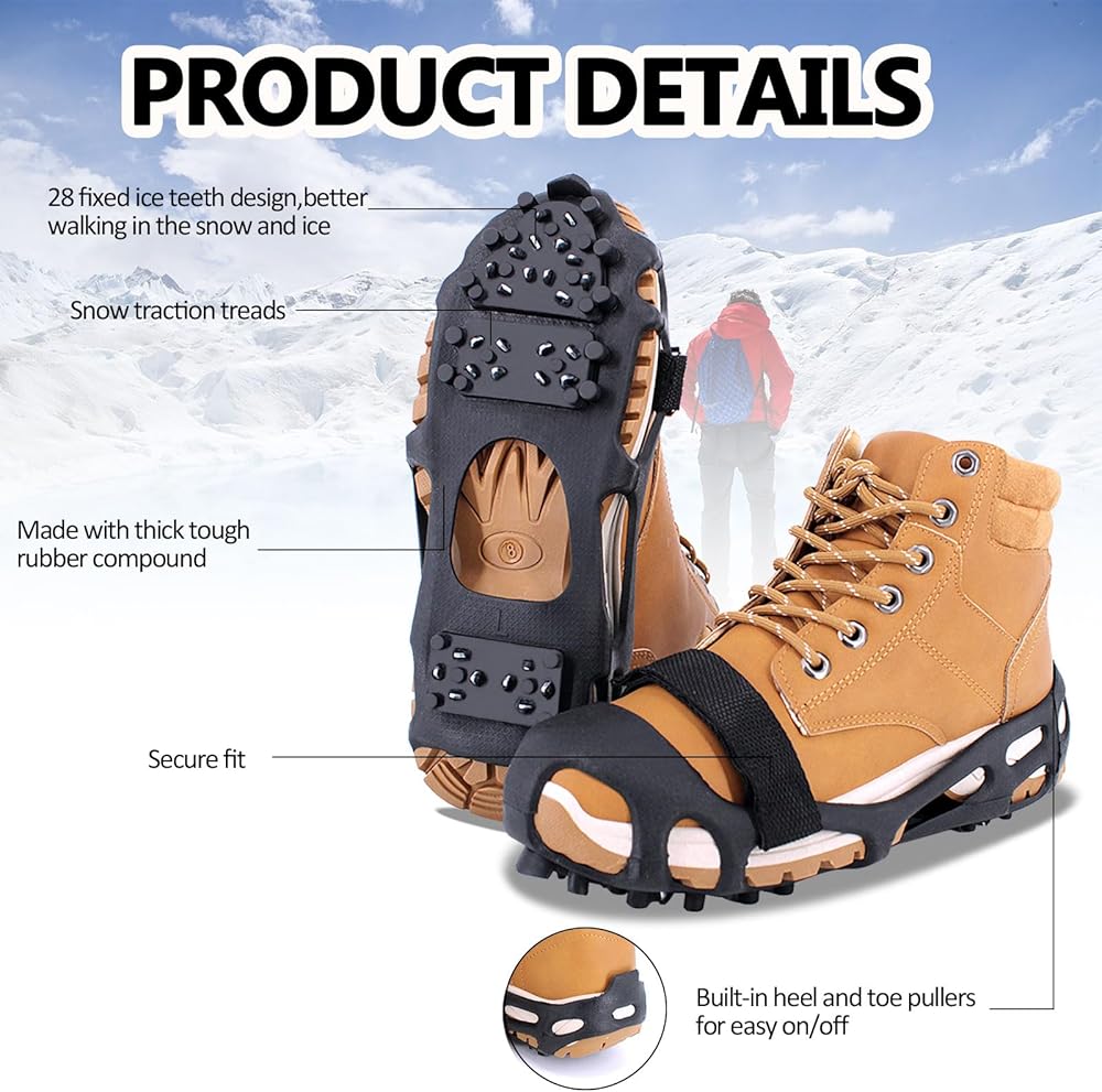 • 【NEWEST ADVANCED DESIGN】The crampons shoe spikes are designed with abrasion-resistant 28 multi-directional enhanced stainless steel 360 degrees aggressive traction spikes,and add spacers at the link between the spikes and the silicone to avoid slipping or blowing down on ice,snow-covered,wet pavement and gravel,REDUCE INJURY.Full cover on heel and forefoot,elastic stretch considerably to fit appropriately over your shoes,boots,sneakers or casual shoes.Ice cleats for boots,Ice spikes for shoes.