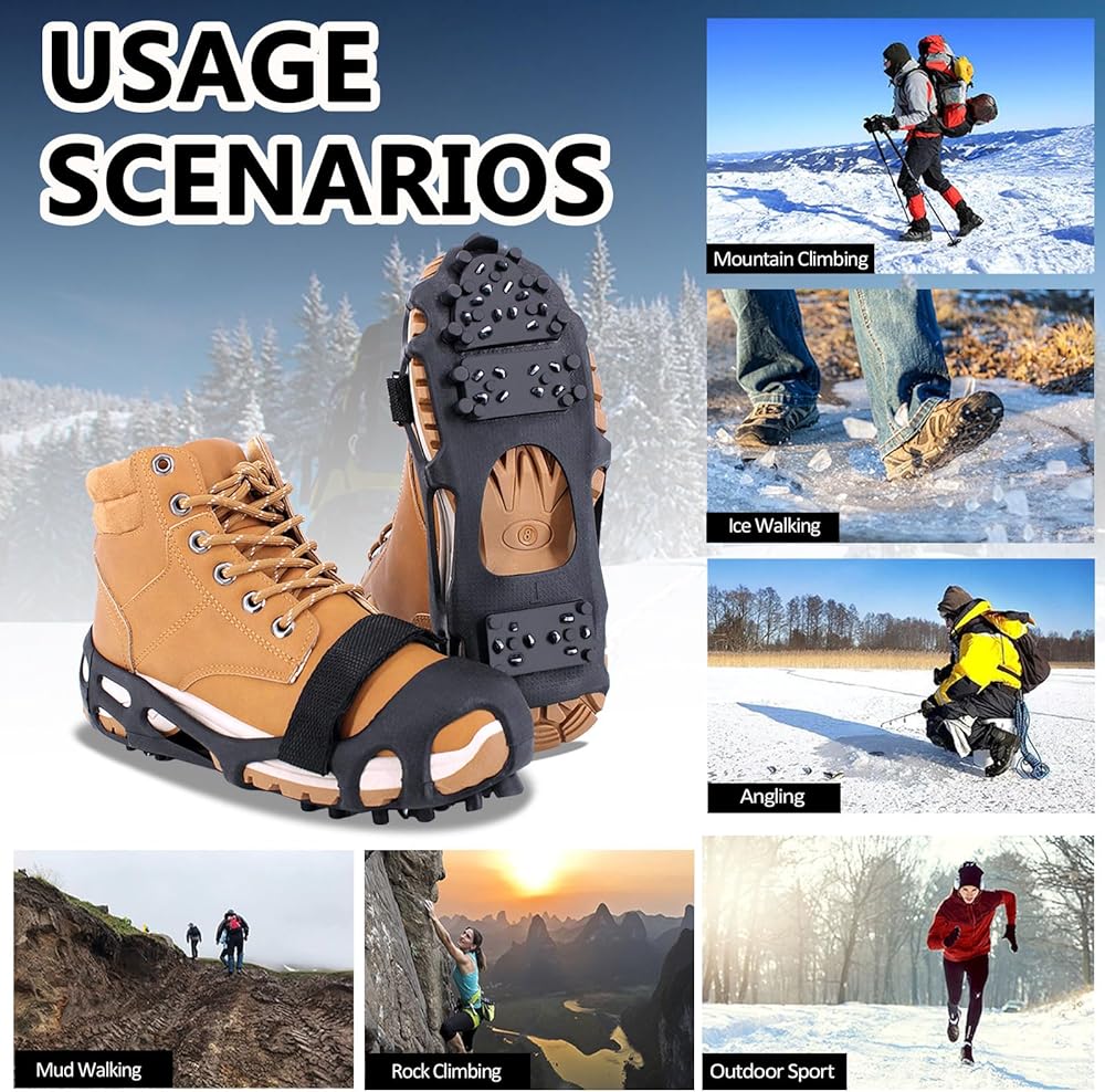 • 【WIDELY USED】Our micro spikes are perfect for angled terrain,ice roads,icy driveway,heavy snow,ice river,freezing ground,freezing mud,cement,wet grass,snow shoveling,ice fishing,hiking/hike,trek,exploring,hunting,jogging,trail running/run,walking in poor winter conditions,outdoor activities,allowing you to access and enjoy your favorite destinations.Hiking spikes for shoes,mountaineering & ice climbing crampons for hiking boots women,crampons for hiking boots men,winter walking ice cleats