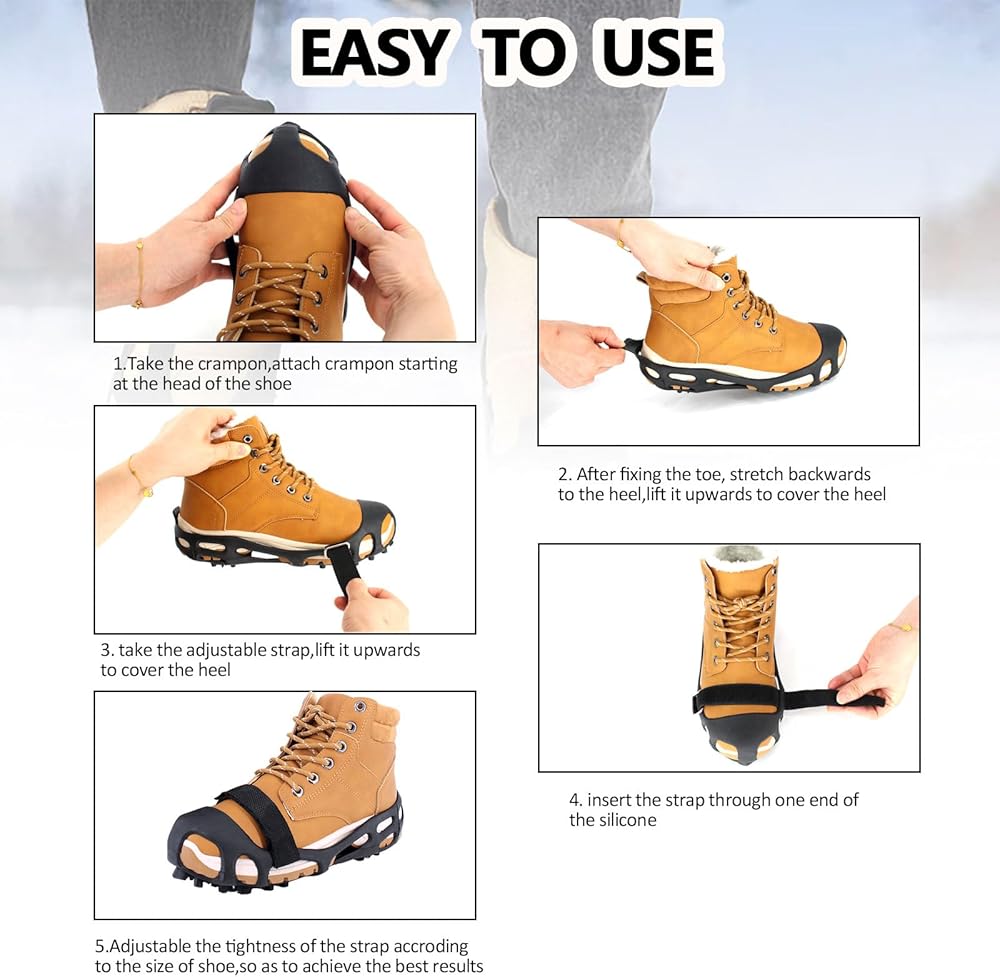 • 【EASY TO TAKE ON & OFF】You just need buckle the front end of the crampons on the toe of the shoe and place the back on the heel,then adjust it appropriately.After use,pull it off,fold it,then put it into your carry-on backpack,saving much space.Ice crampons for shoes and boots,ice cleats for winter boots and shoes,ice spikes for shoes and boots large,ice fishing cleats for boots,boot ice cleats for ice and snow,shoe cleats for snow and ice,crampons ice cleats traction snow grips for boots shoes