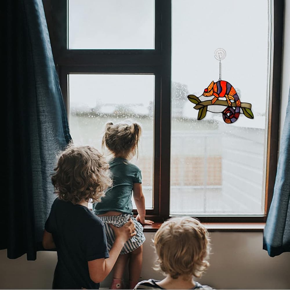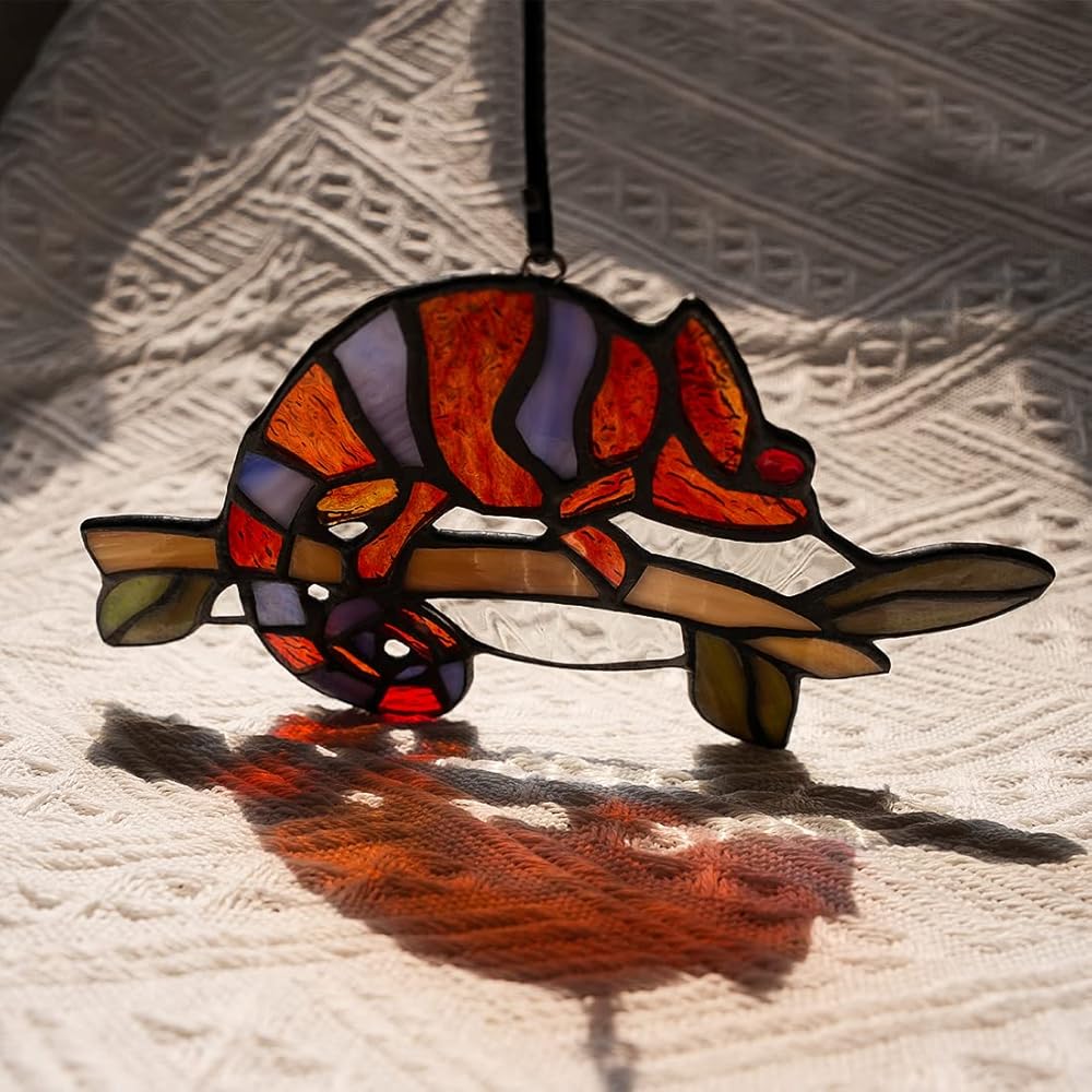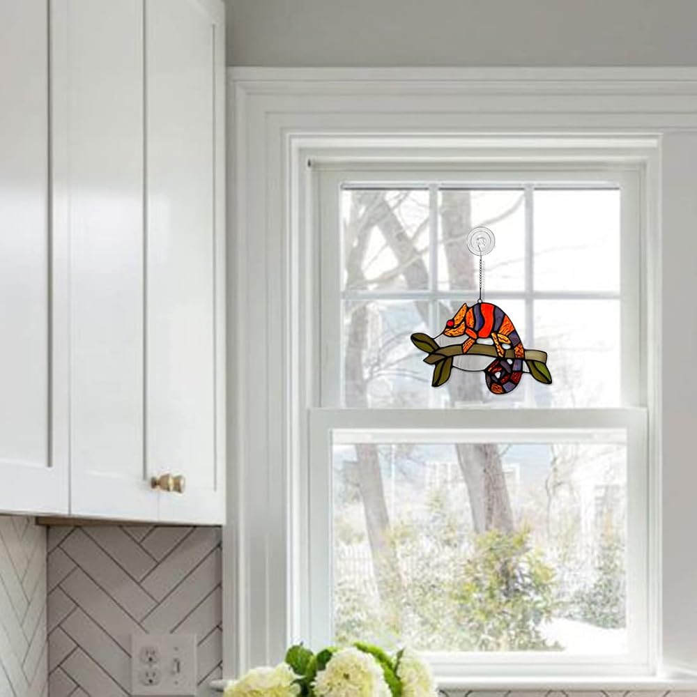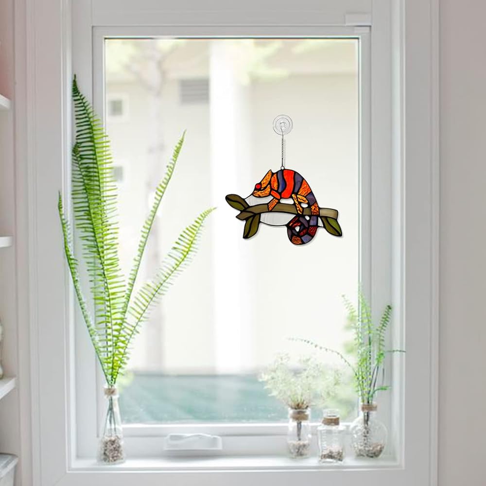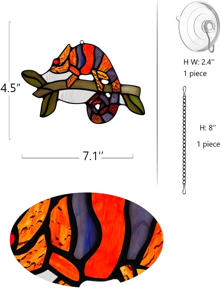 تصميم سحلية فريد من نوعه: تقنية قطع رائعة، تجلس السحلية على فرع، تمامًا مثل السحلية الحقيقية. اجعل تعليق الحائط ديكور السحلية يبدو نابضًا بالحياة. صدق أن ديكور الزجاج الملون للنافذة الداخلية هذا سيضيف جوًا دافئًا وساحرًا إلى منزلك وحديقتك.