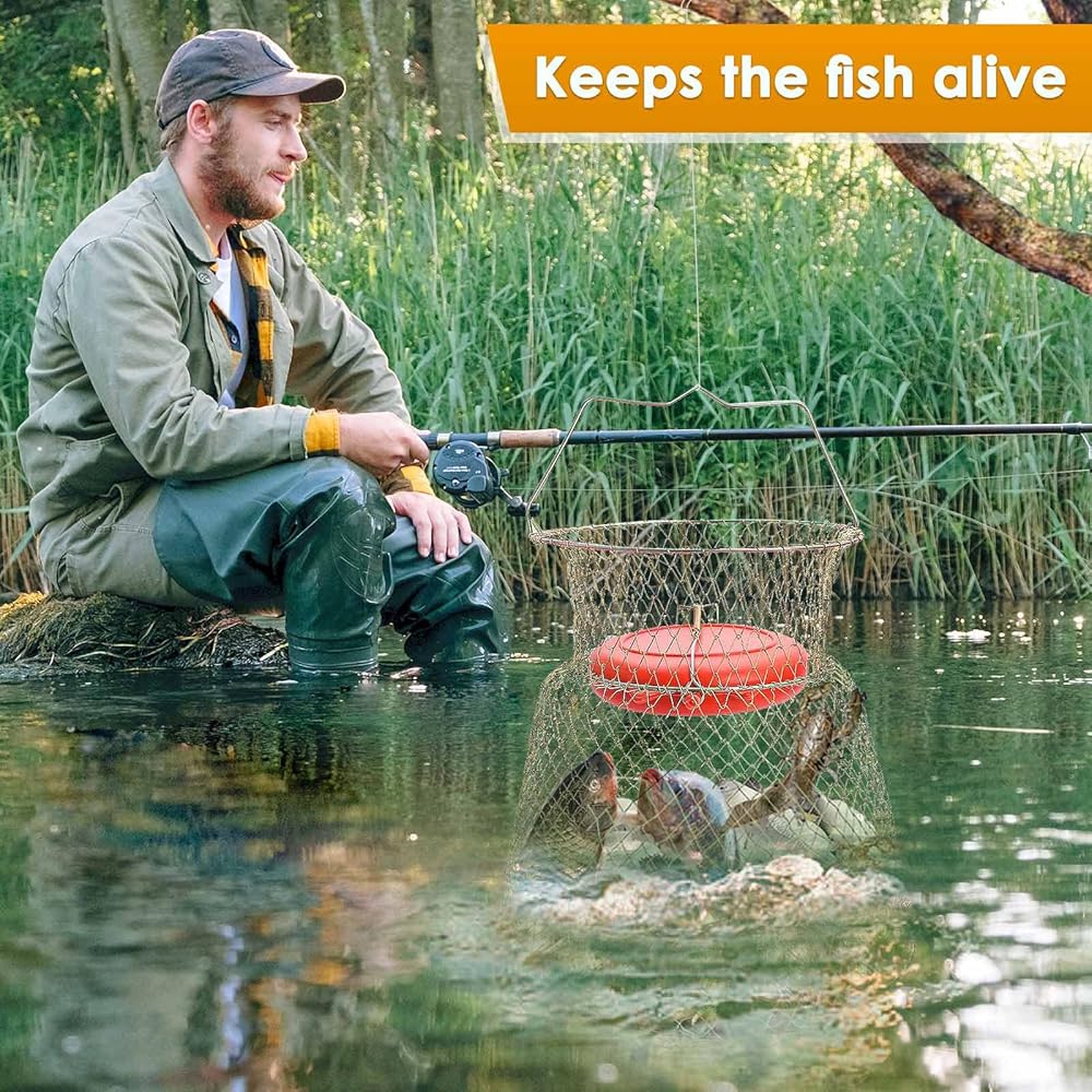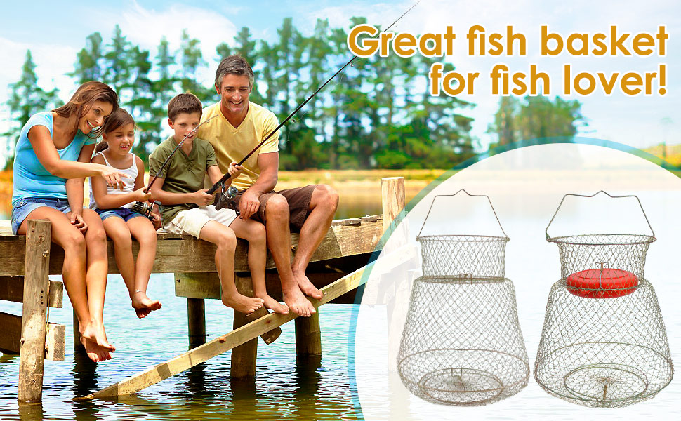 • 🐟🐟【Package Includes】Comes with 2 steel wire fish baskets,one regular style and one floatable style.The dispaly size of the fish basket is 11.8*13.8inch(30*35cm),which can hold fish,shrimp,crab,crawfish and so on.