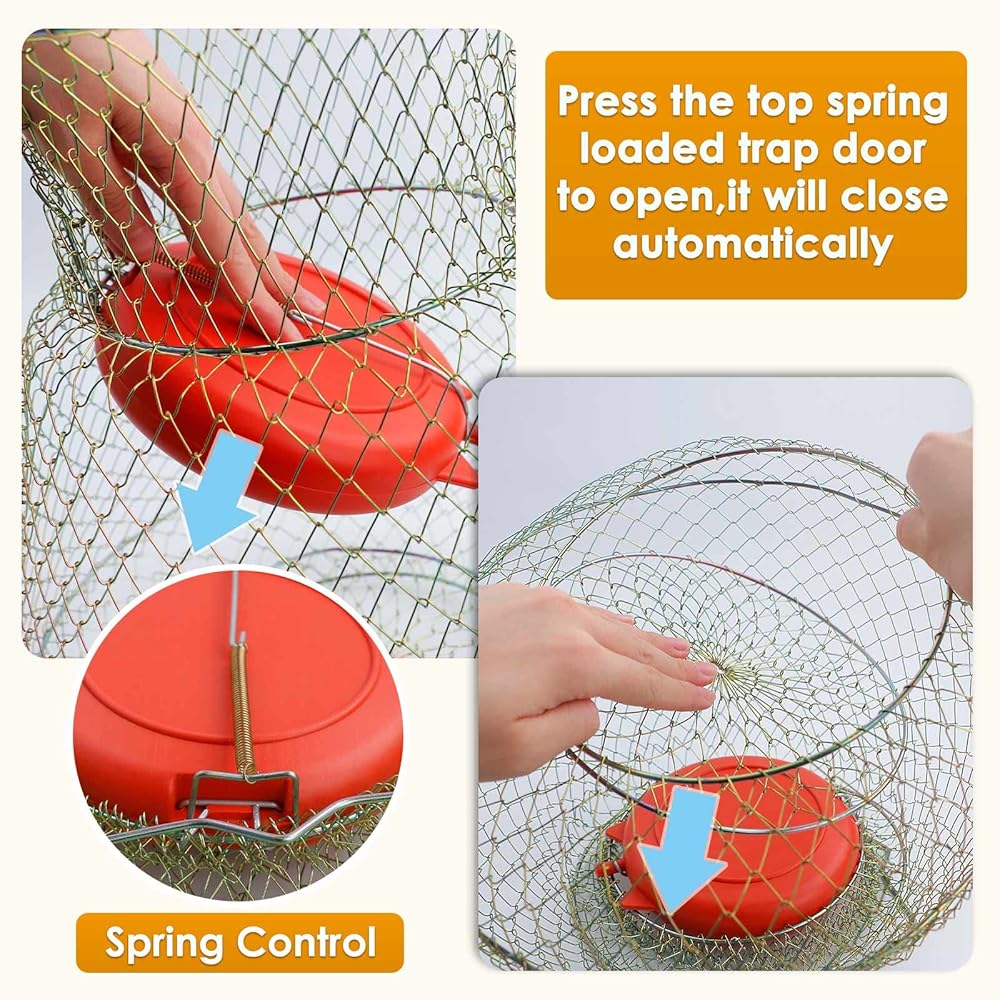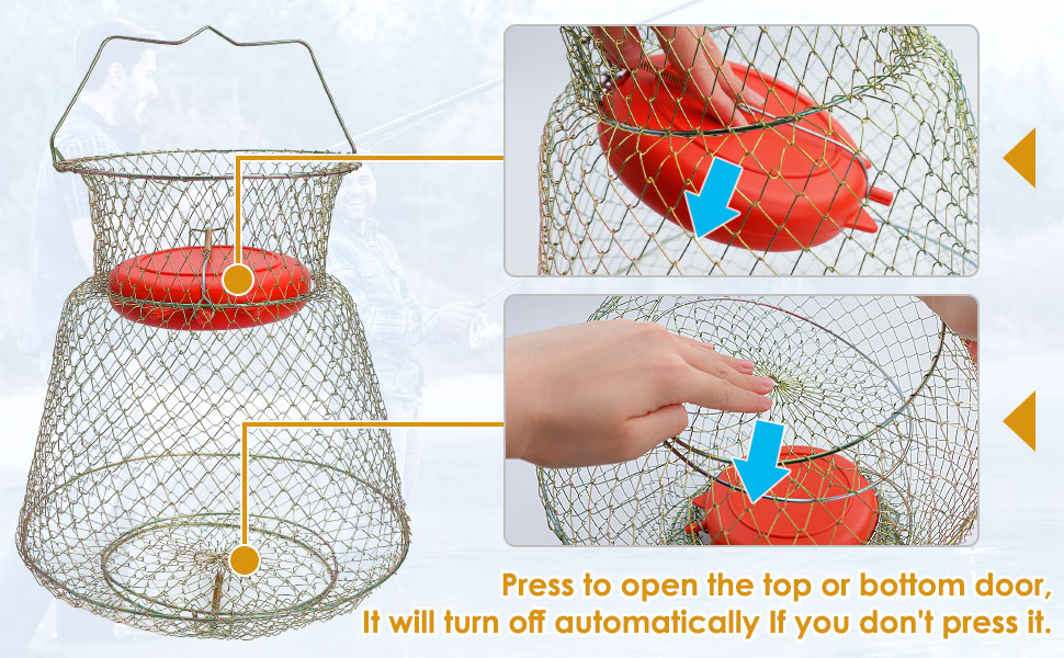 • 🐟🐟【Two Doors】It comes with two spring loaded trap doors---a top one and a bottom one.Top door for put fish,crab and crawfish into the backet.Bottom gate make it easy to take out fish.All hinges are reinforced,which ensures a long life use.